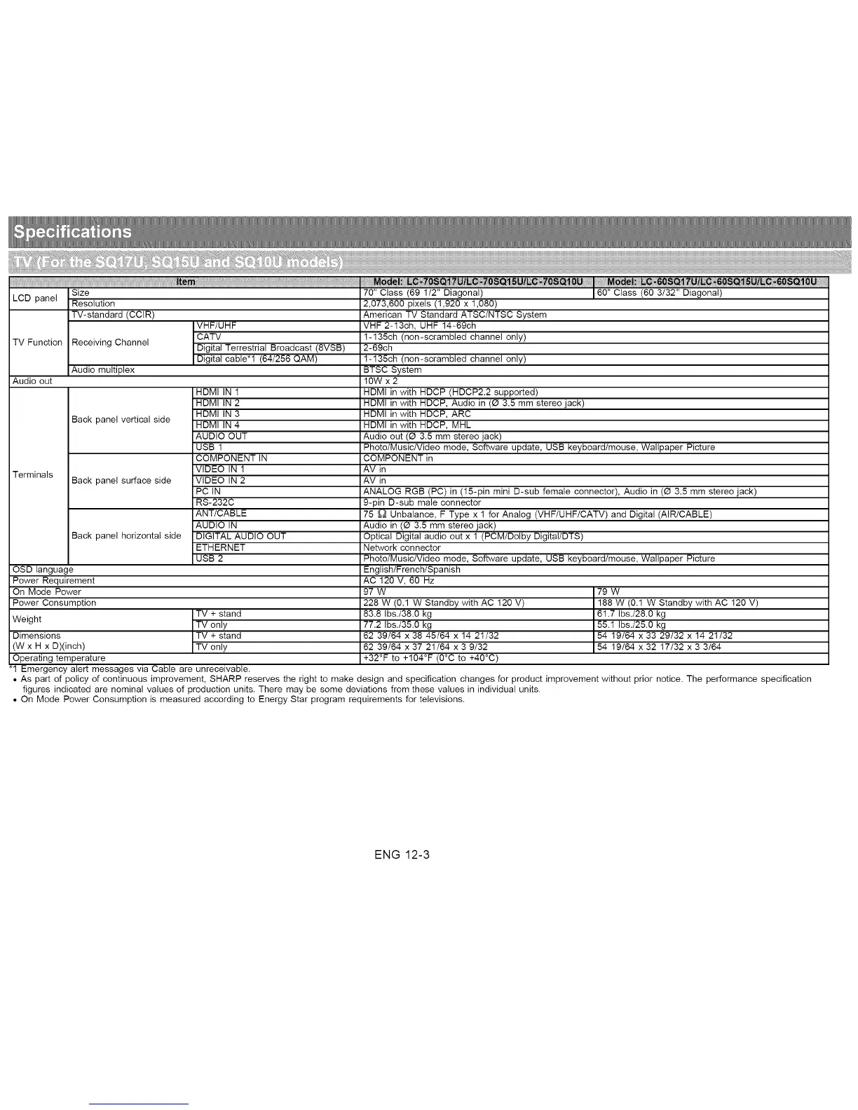 • As part of policy of continuous improvement, SHARP reserves the right to make design and specification changes for product improvement without prior notice. The performance specification
