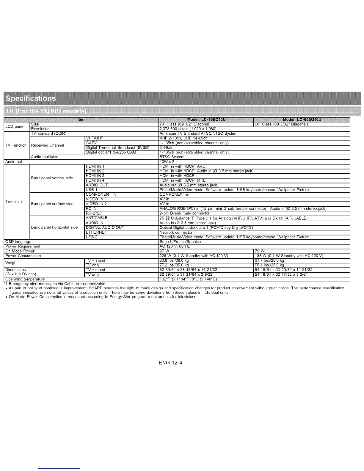• On Mode Power Consumption is measured according to Energy Star program requirements for televisions.