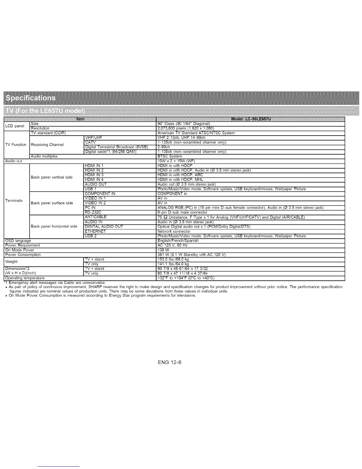 • On Mode Power Consumption is measured according to Energy Star program requirements for televisions.