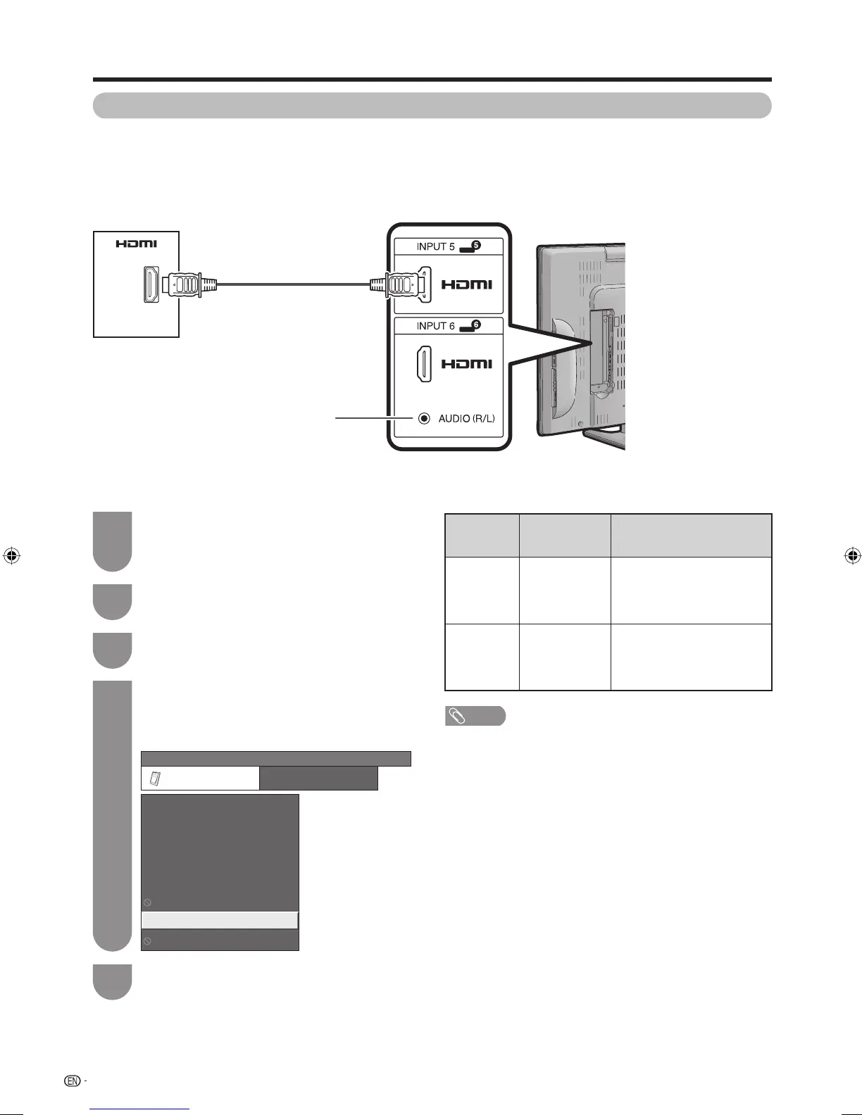 output the audio and picture from an HDMI output device on the TV, select “INPUT4”, “INPUT5” or “INPUT6” by