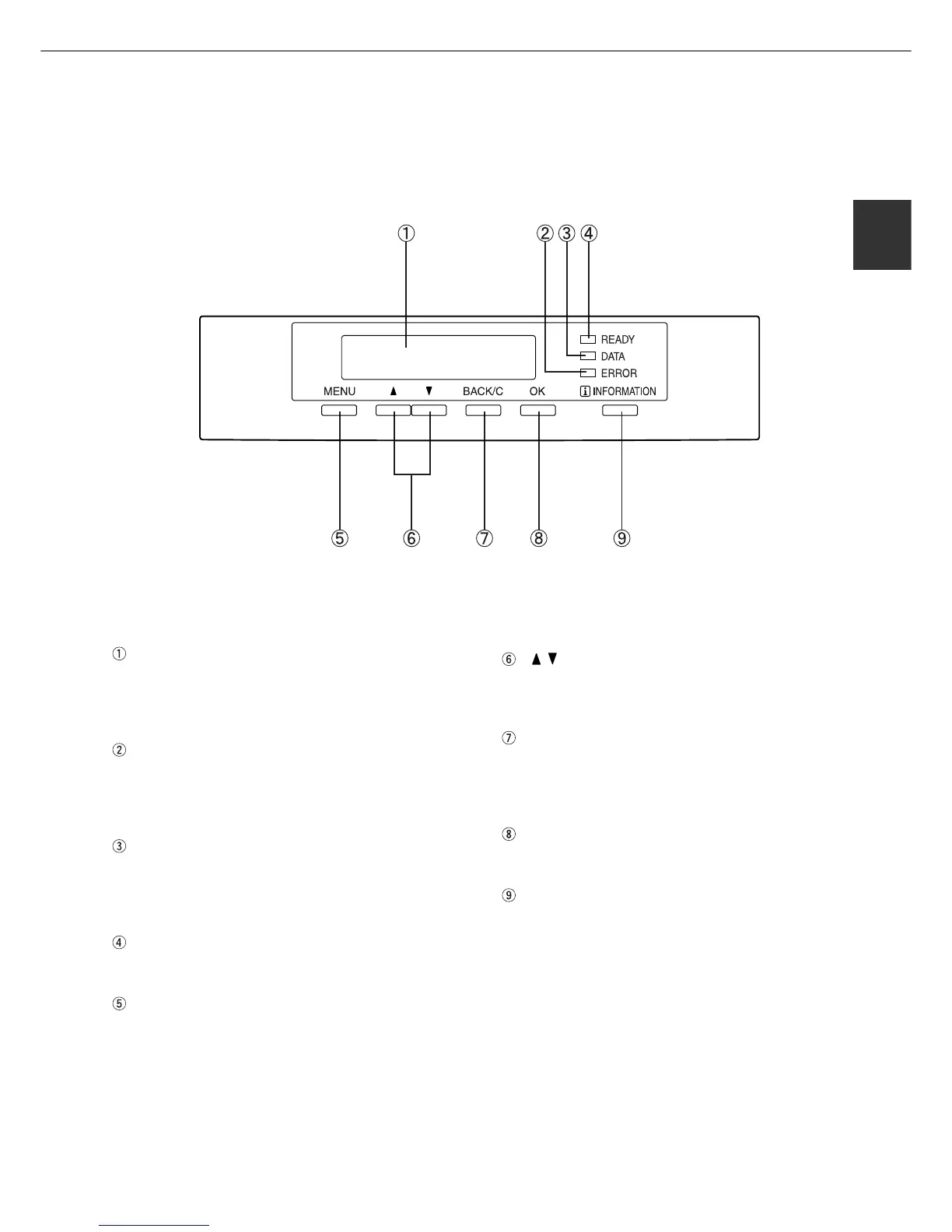 The display and indicators show the current status of the printer. All printer settings are made by using the keys and