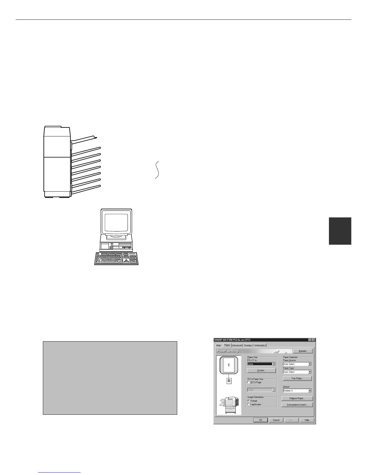 Printed output can be specified in the printer driver to be delivered to an assigned mail bin or to the top tray. Assigning