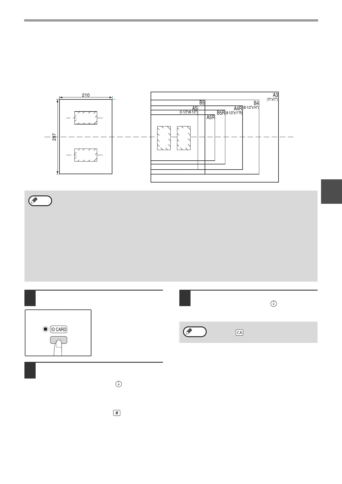 • In ID card copy mode, scan area and scan number (1 page) cannot be changed. Scan area is: X: 54 + 5 mm