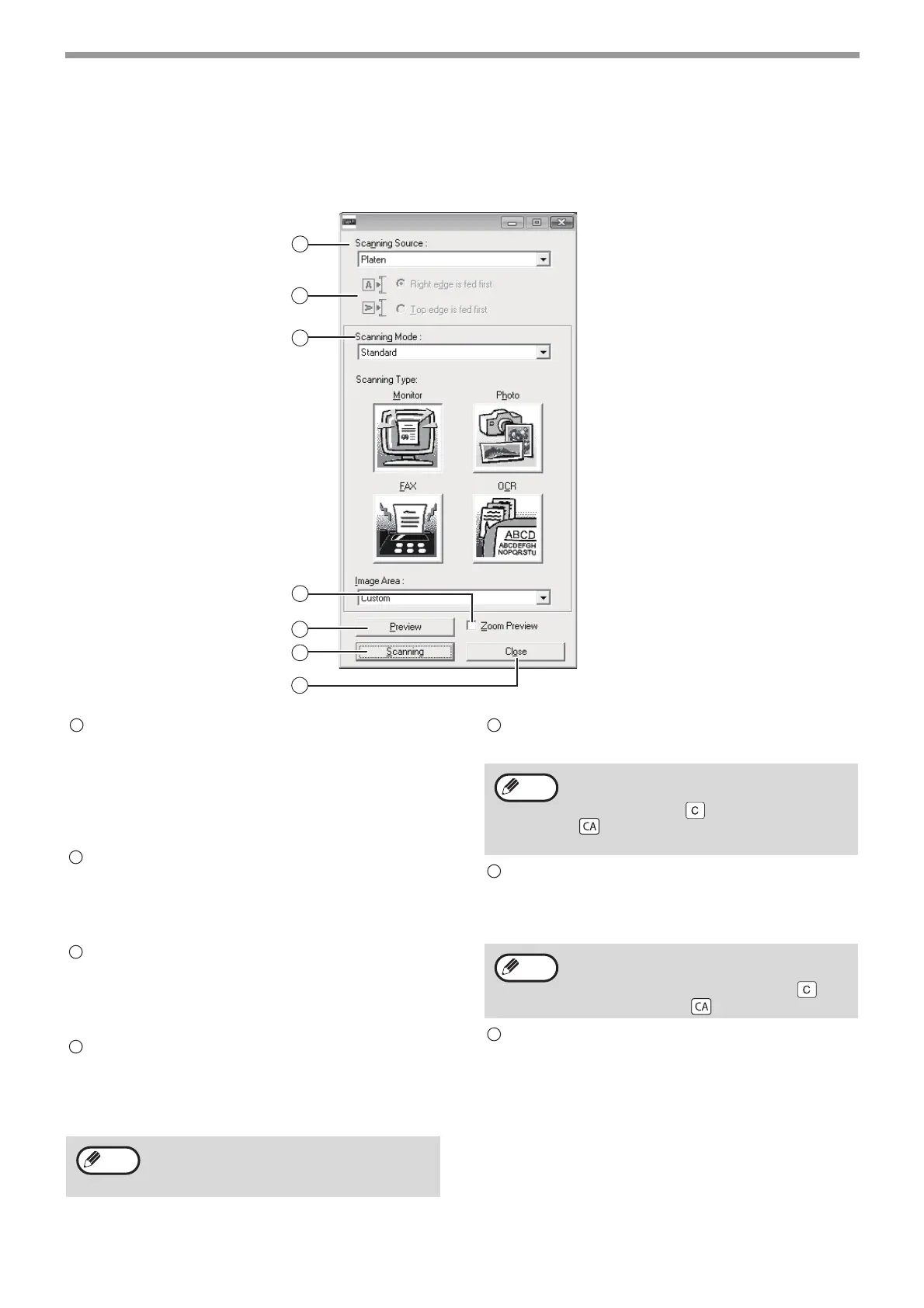 "Preview screen", which shows the scanned image. For details on the scan settings, click the "Help" button in the