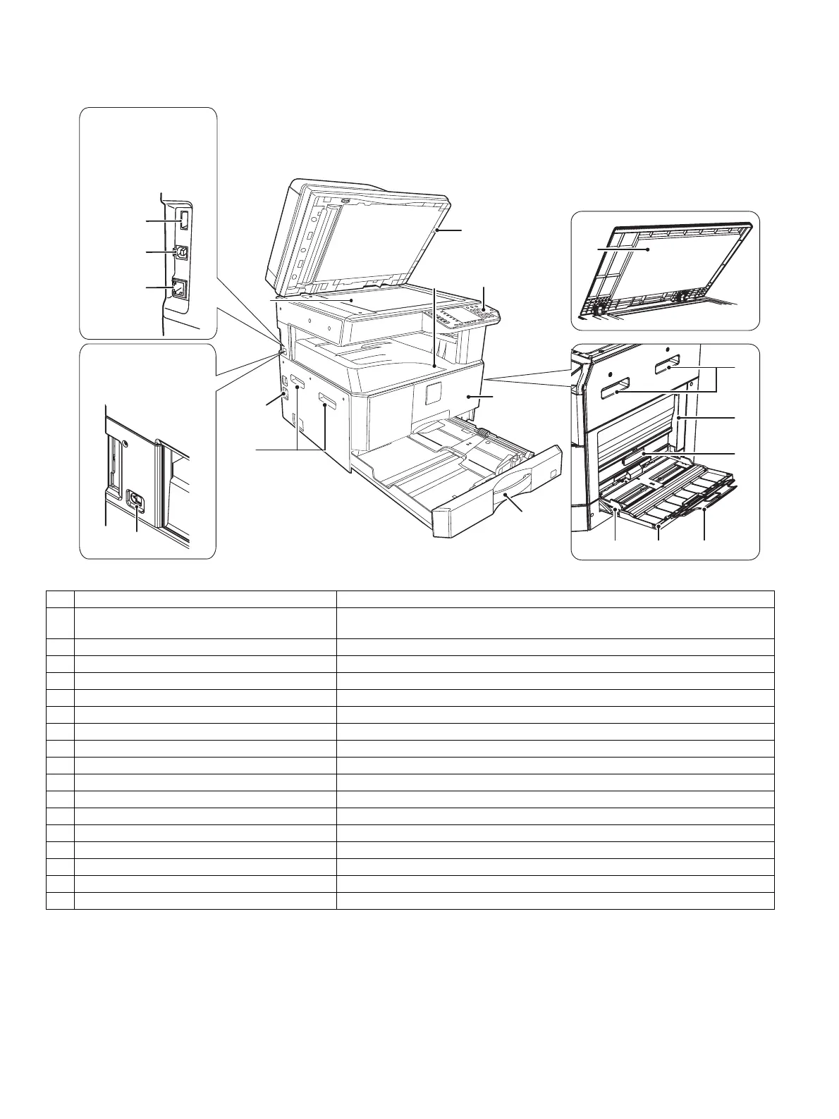 15 Bypass tray extension Pull out when feeding large paper such as A3 and B4 (11" x 17" and 8-1/2" x 14").