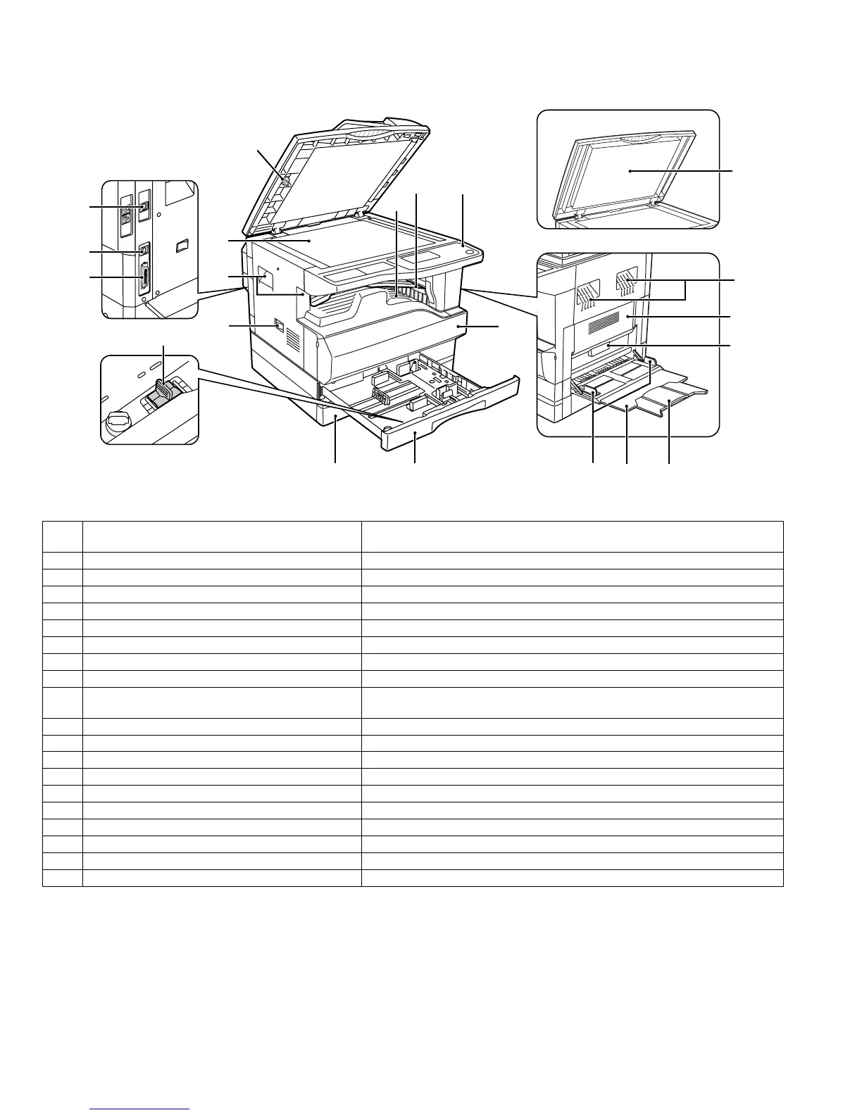 20 Bypass tray extension Pull out when feeding large paper such as 11" x 17" and 8-1/2" x 14" (A3 and B4).