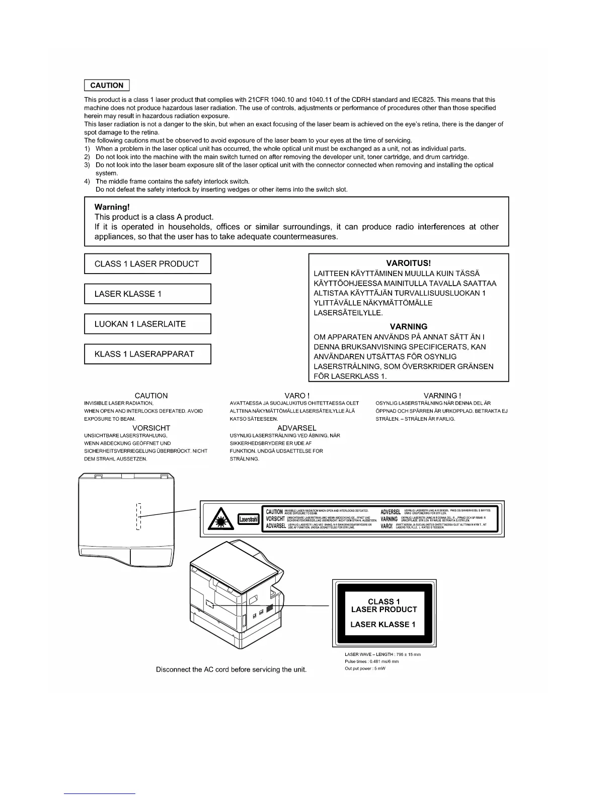 Sharp AR-M165 - Safety Precautions; Laser Safety CAUTION; Laser Safety Warning