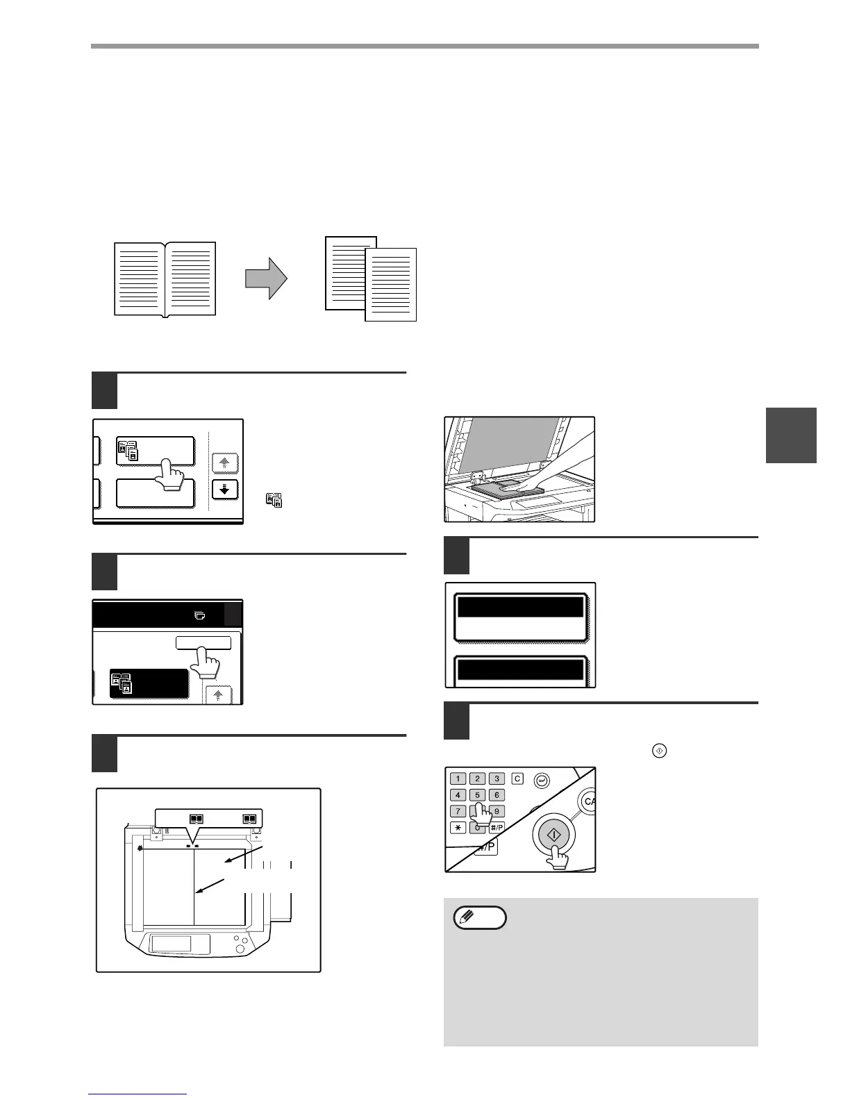 The dual page copy function produces separate copies of two adjoining pages on the document glass. It is