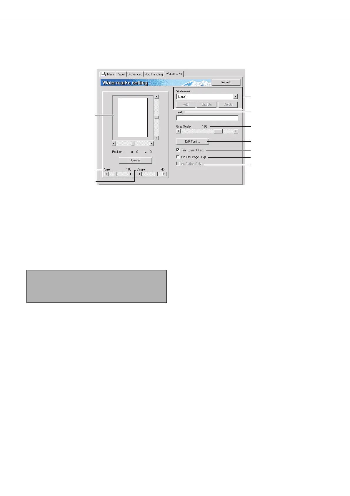 The following window appears when the [Watermarks] tab is clicked. The settings and buttons are explained below.