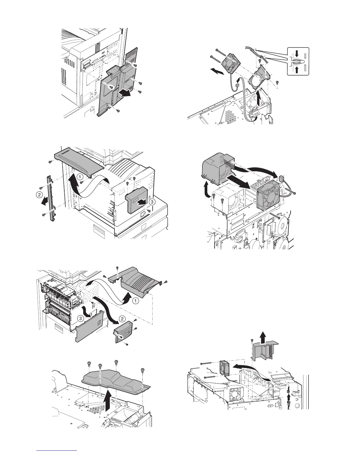 3) Remove the paper exit upper cabinet, the left rear cabinet, and