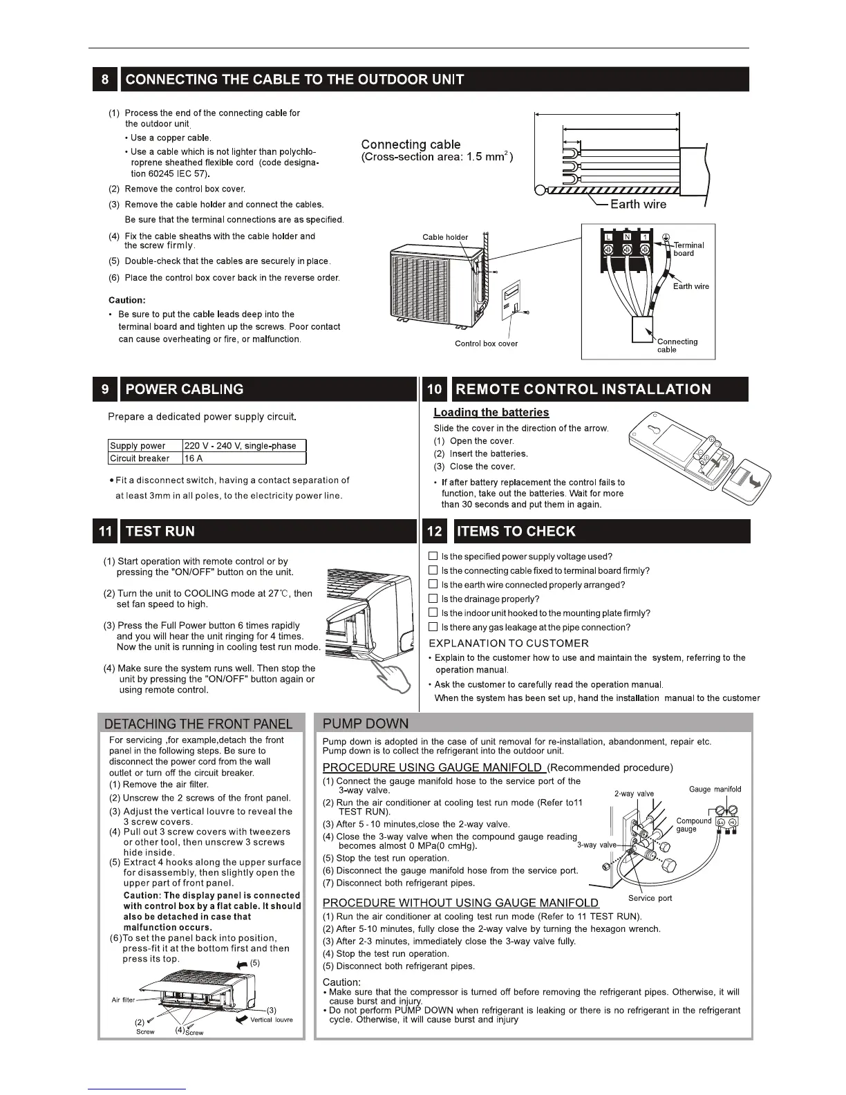 Sharp AY-X12PSR - Connecting the Cable to the Outdoor Unit; Power Cabling; Remote Control Installation; Test Run;Items to Check