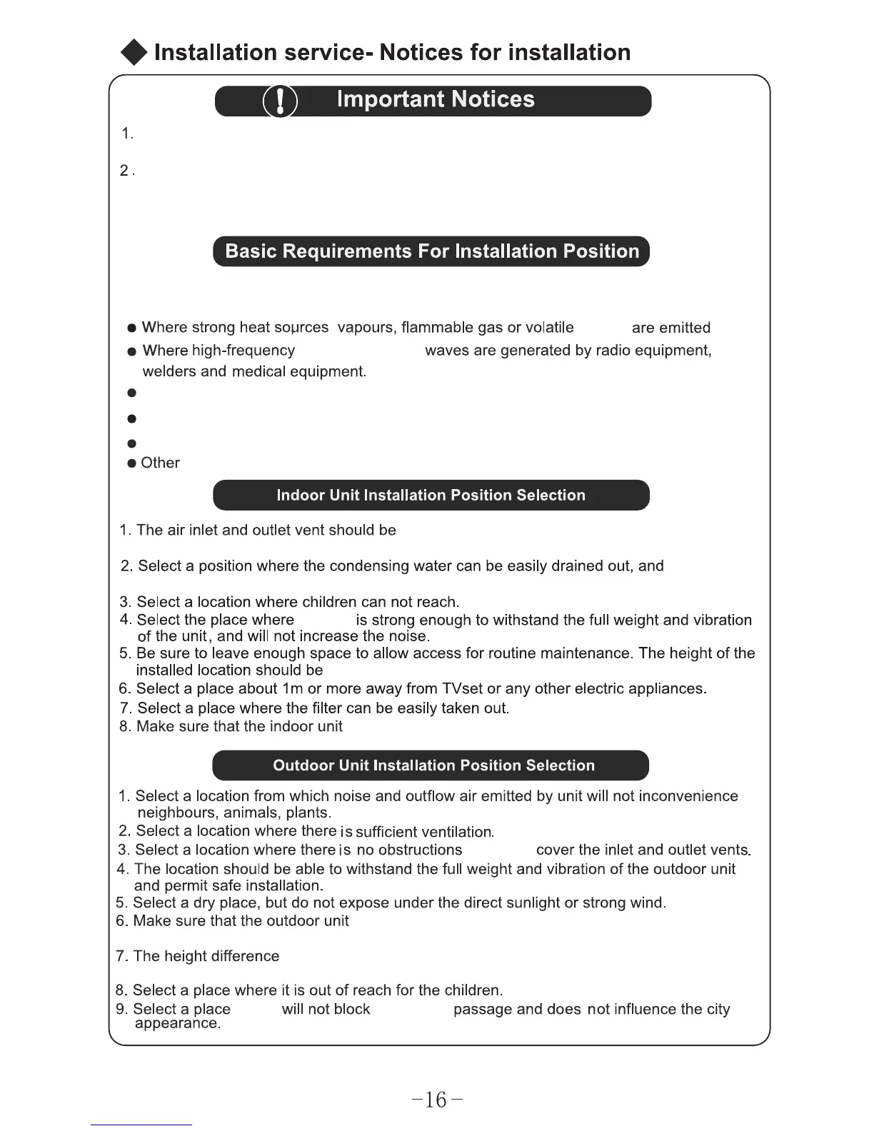 The unit must only be installed by authorised air conditioner contractors according to municipal
