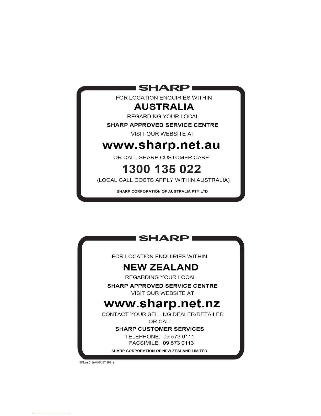 Sharp AY-X24NCJ - Sharp Customer Contact Information; Australia Customer Support; New Zealand Customer Support