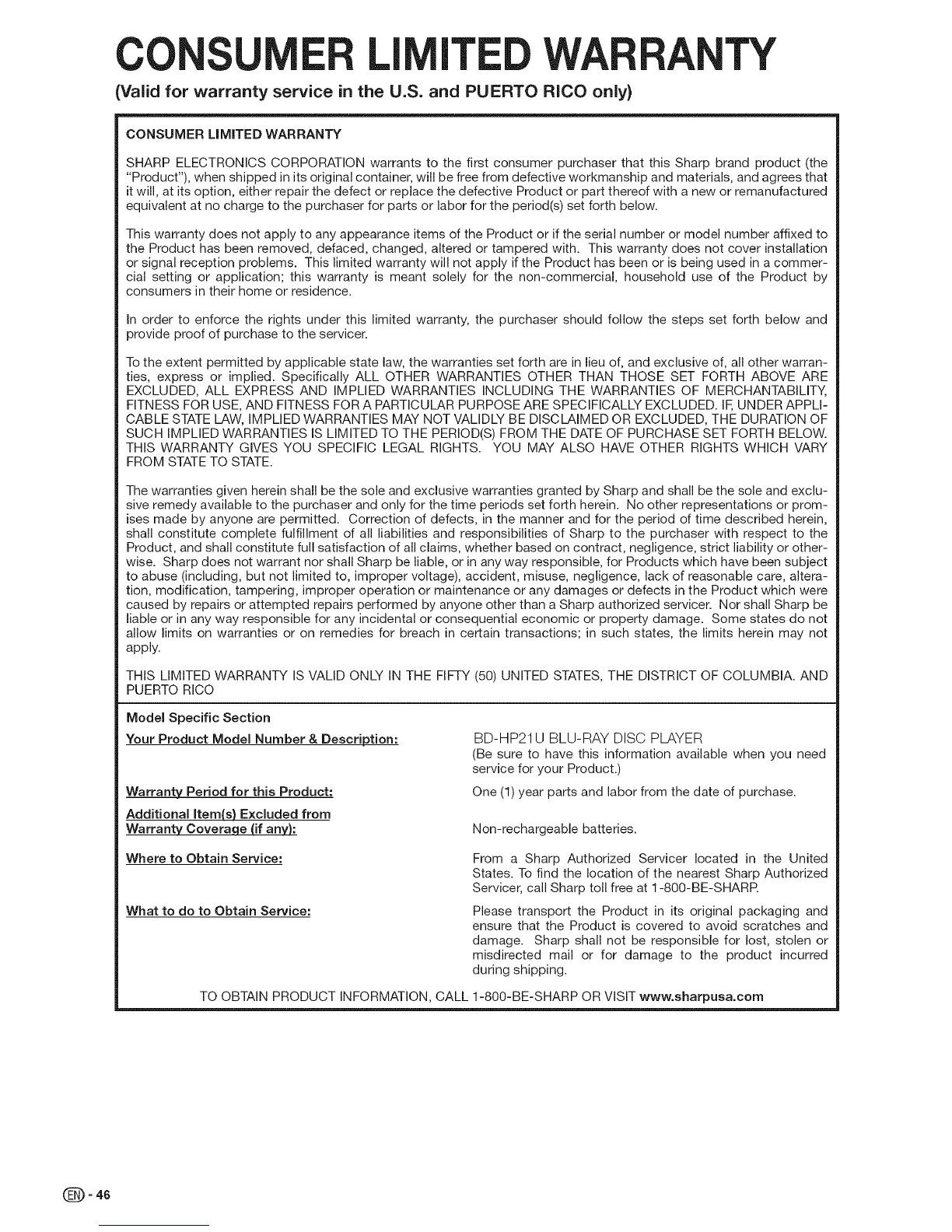 SHARP ELECTRONICS CORPORATION warrants to the first consumer purchaser that this Sharp brand product (the