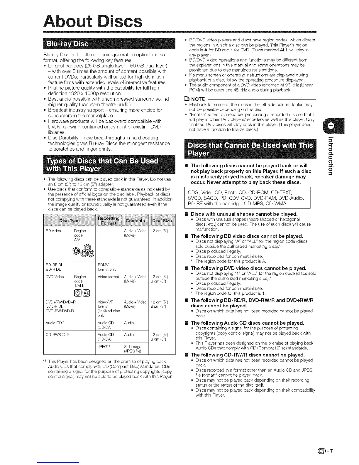 " The following discs can be played back in this Player. Do not use