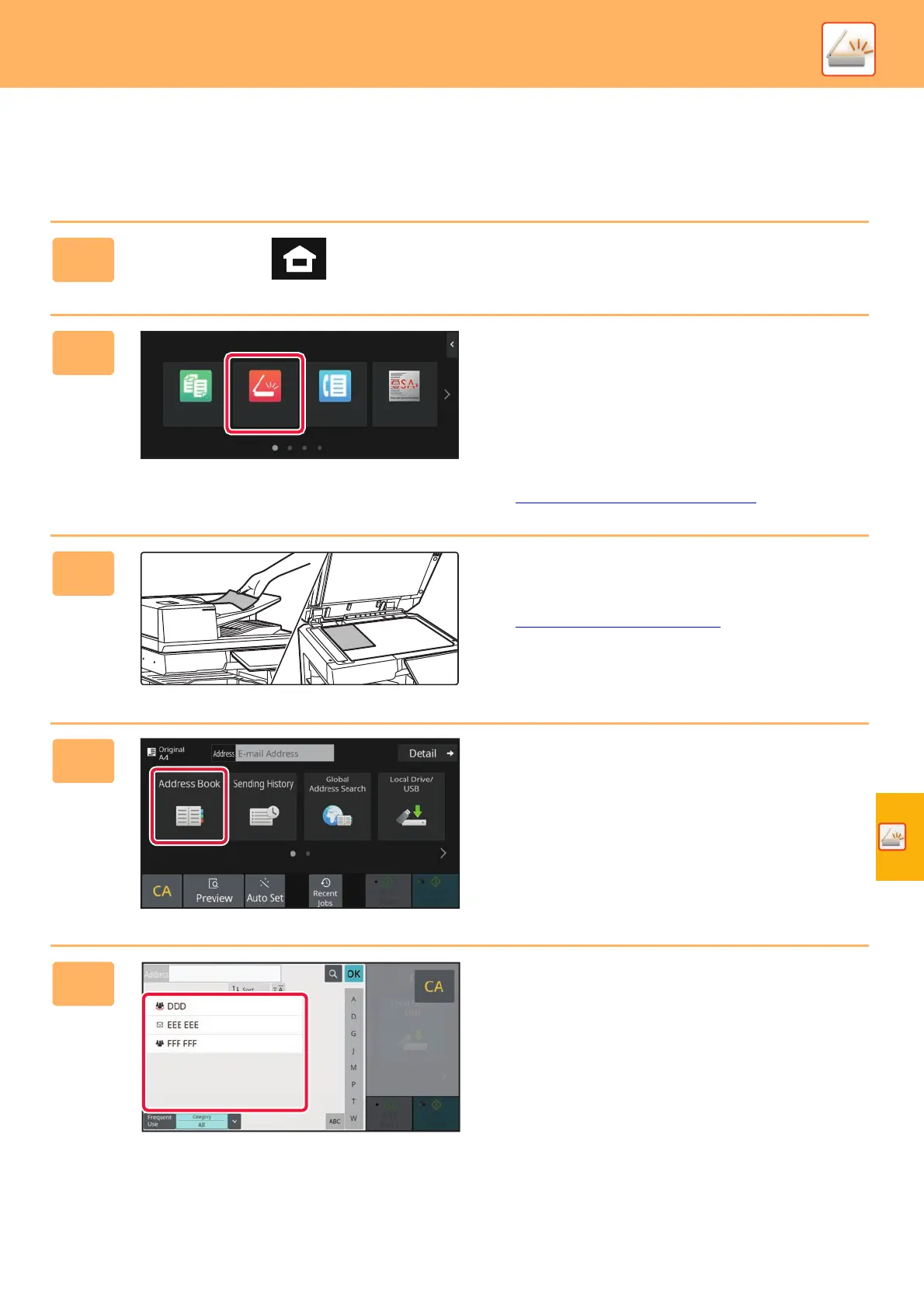 The procedure for sending a scanned file by E-mail to a destination stored in the address book is explained here.