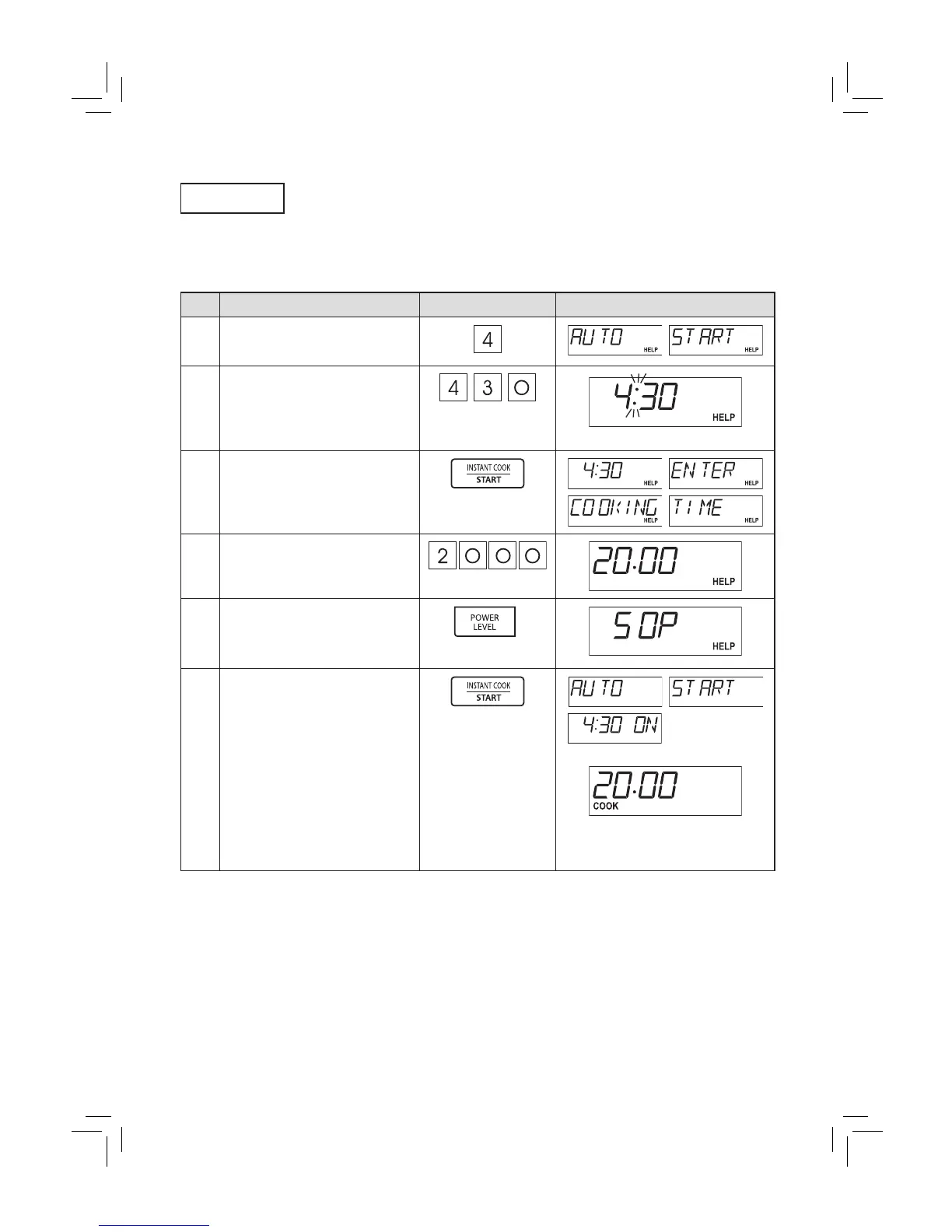 * Suppose you want to start cooking a casserole for 20 minutes at 50% power level at 4:30. (AM or PM)