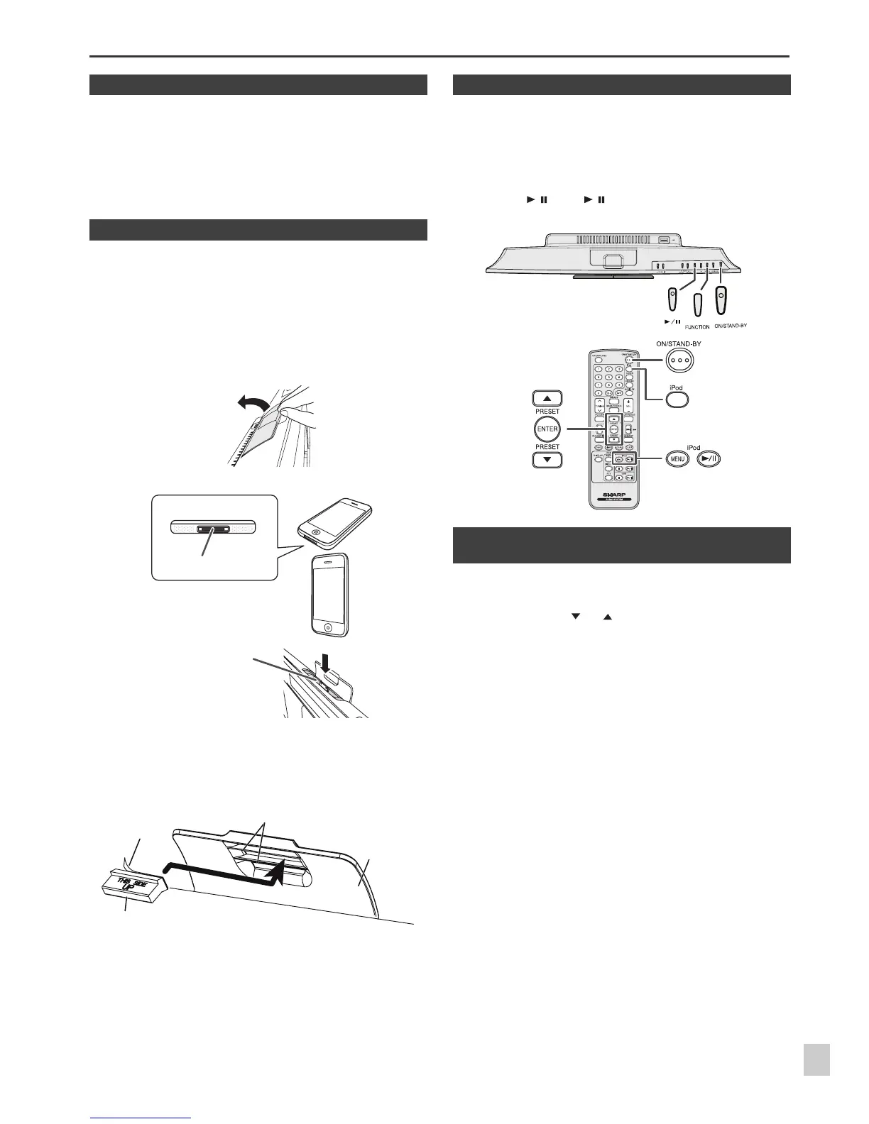 Insert iPod or iPhone unit into the dock of main unit. “DOCK