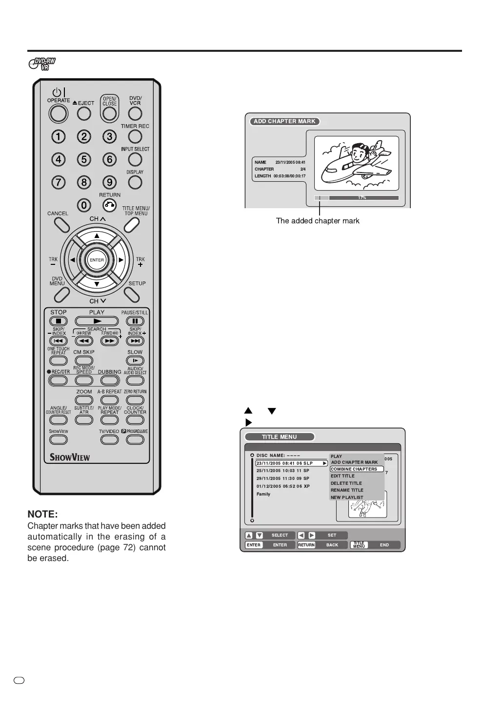 By erasing the added chapter marks, the chapters can be combined.