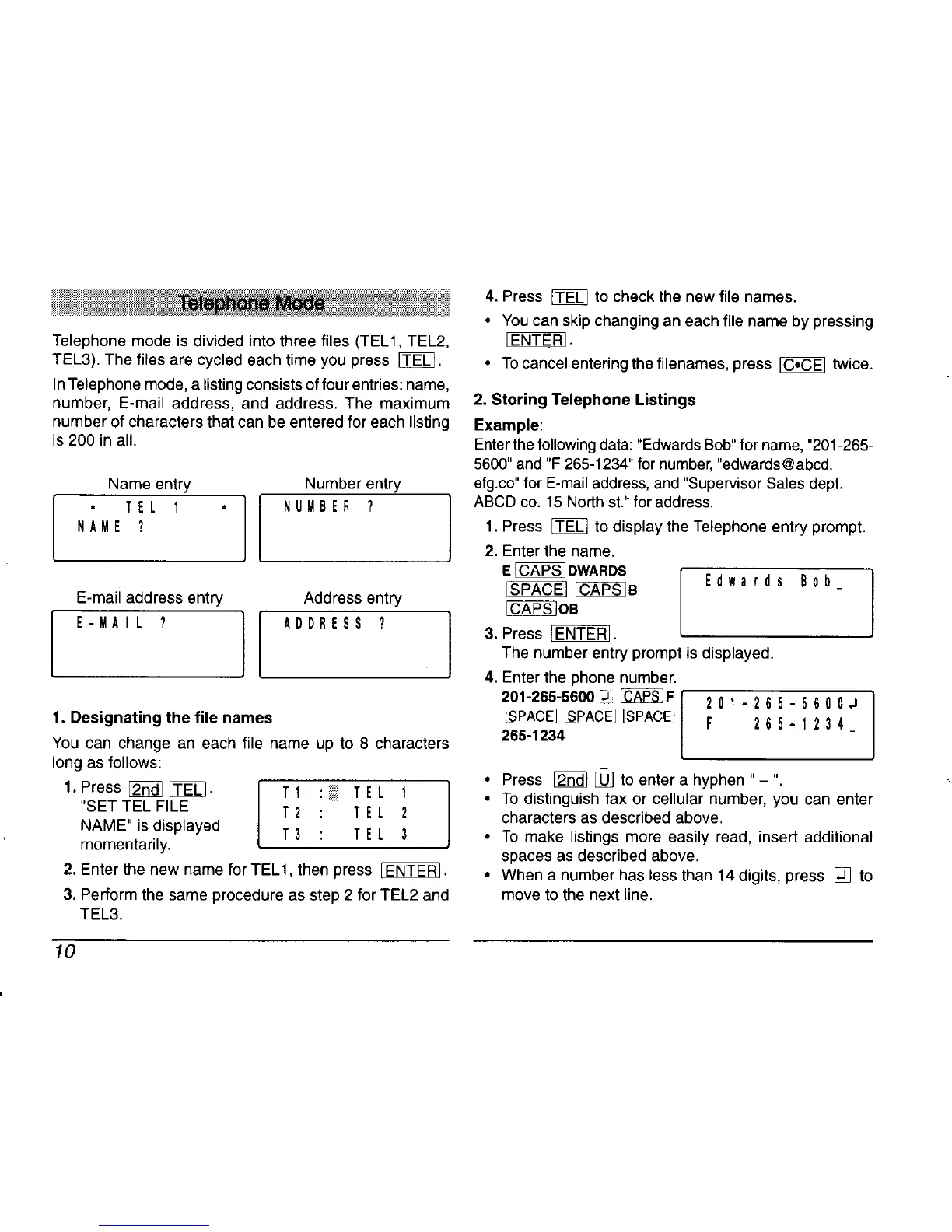 Sharp EL-6560 - Telephone Mode; Designating the File Names; Storing Telephone Listings
