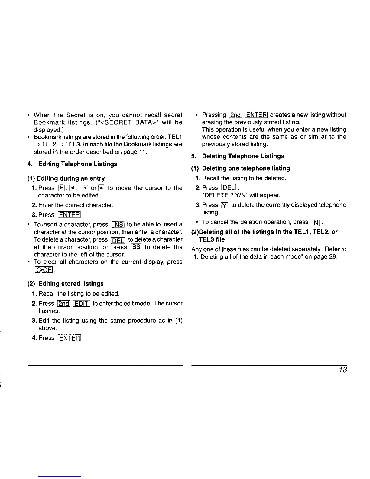 Sharp EL-6560 - Editing Telephone Listings; Editing During an Entry; Editing Stored Listings; Deleting Telephone Listings