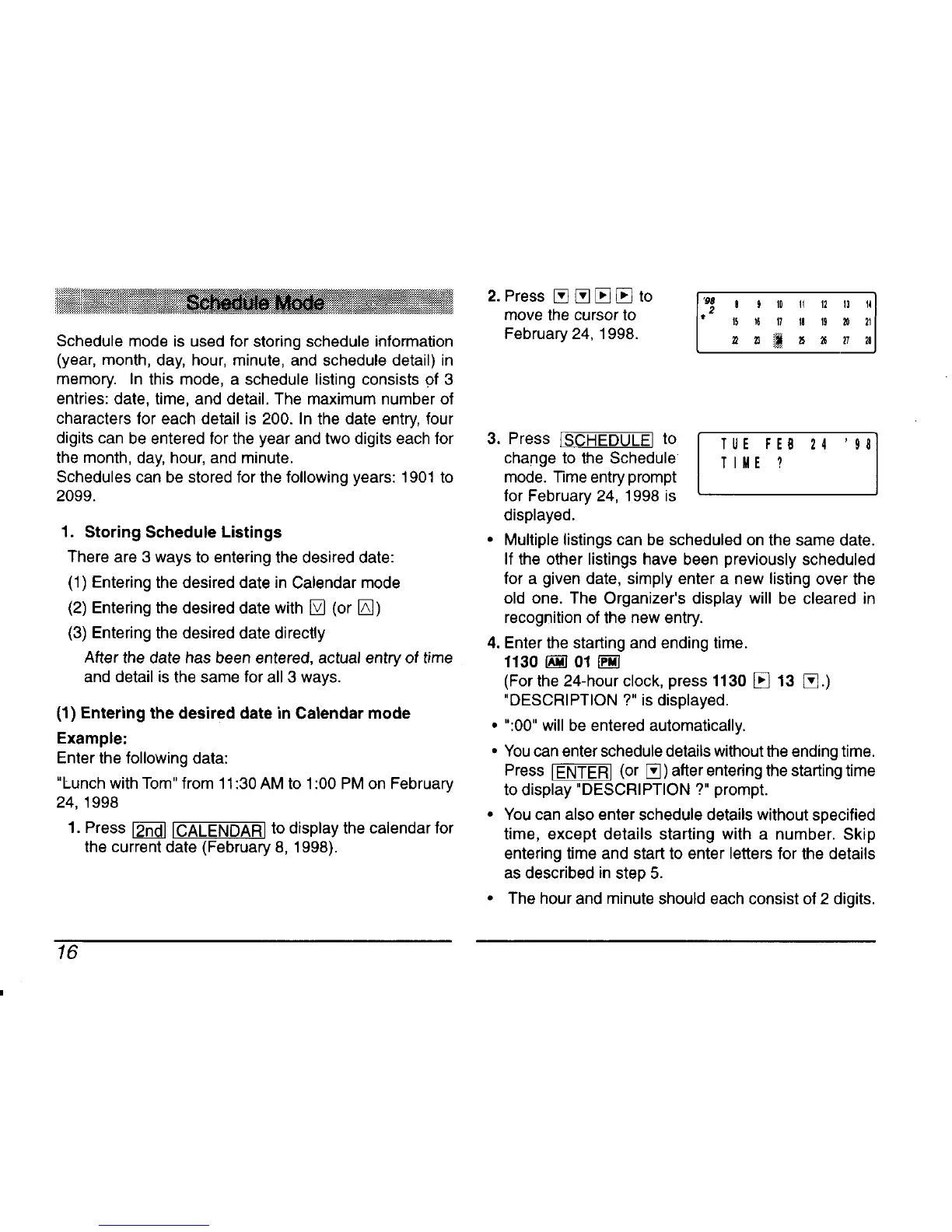 Sharp EL-6560 - Schedule Mode; Storing Schedule Listings; Entering the Desired Date in Calendar Mode