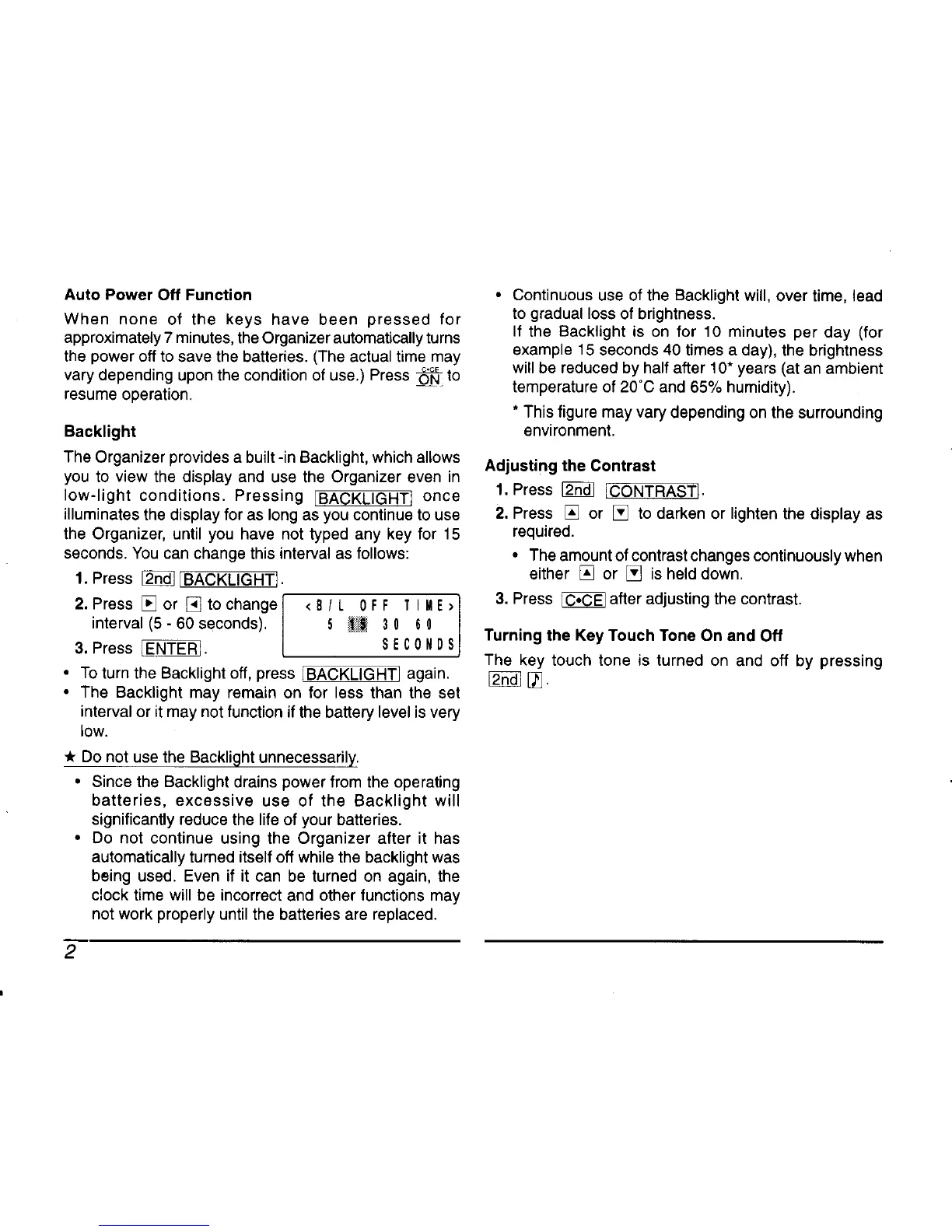 Sharp EL-6560 - Auto Power off Function; Backlight; Adjusting the Contrast; Turning the Key Touch on and off