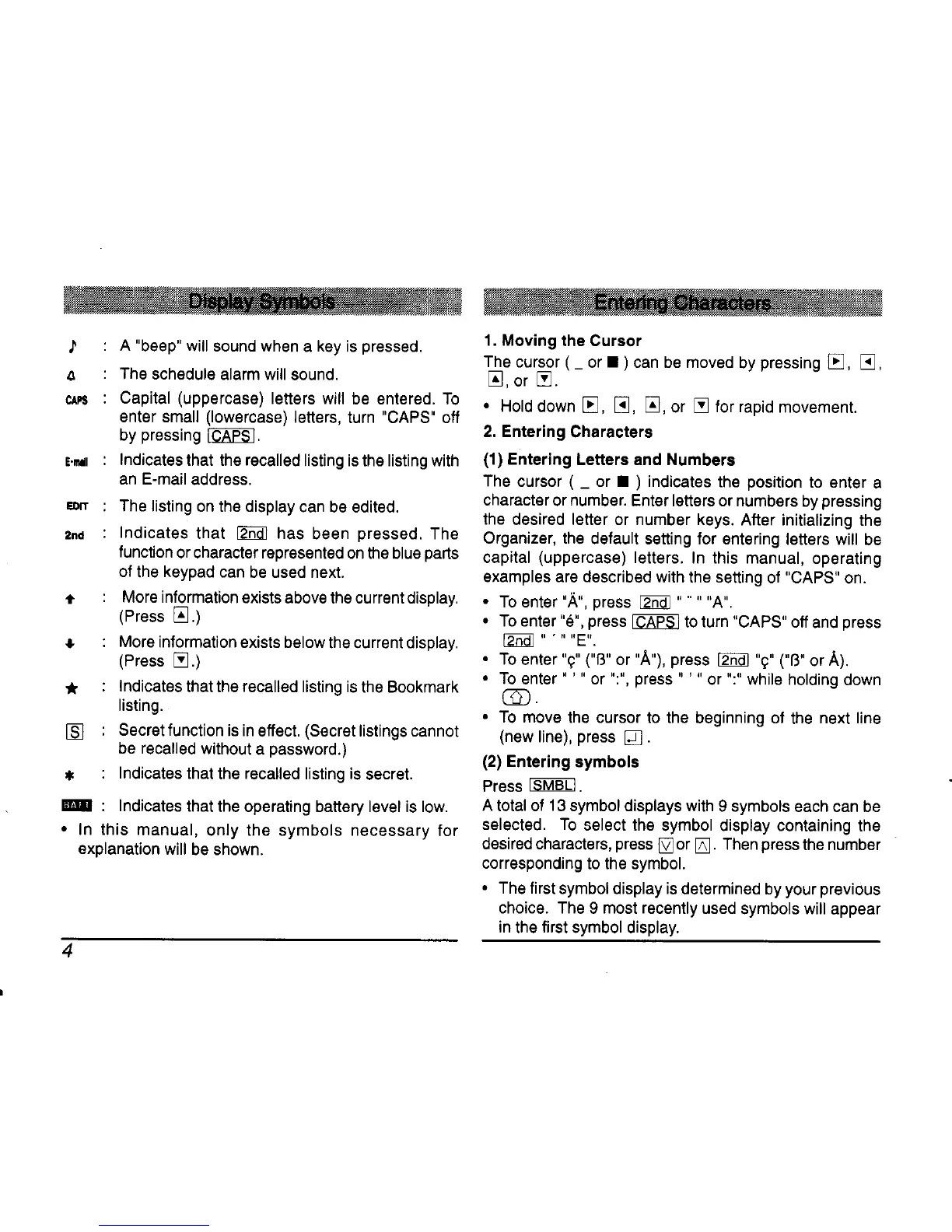 Sharp EL-6560 - Display Symbols; Entering Characters; Moving the Cursor; Entering Letters and Numbers