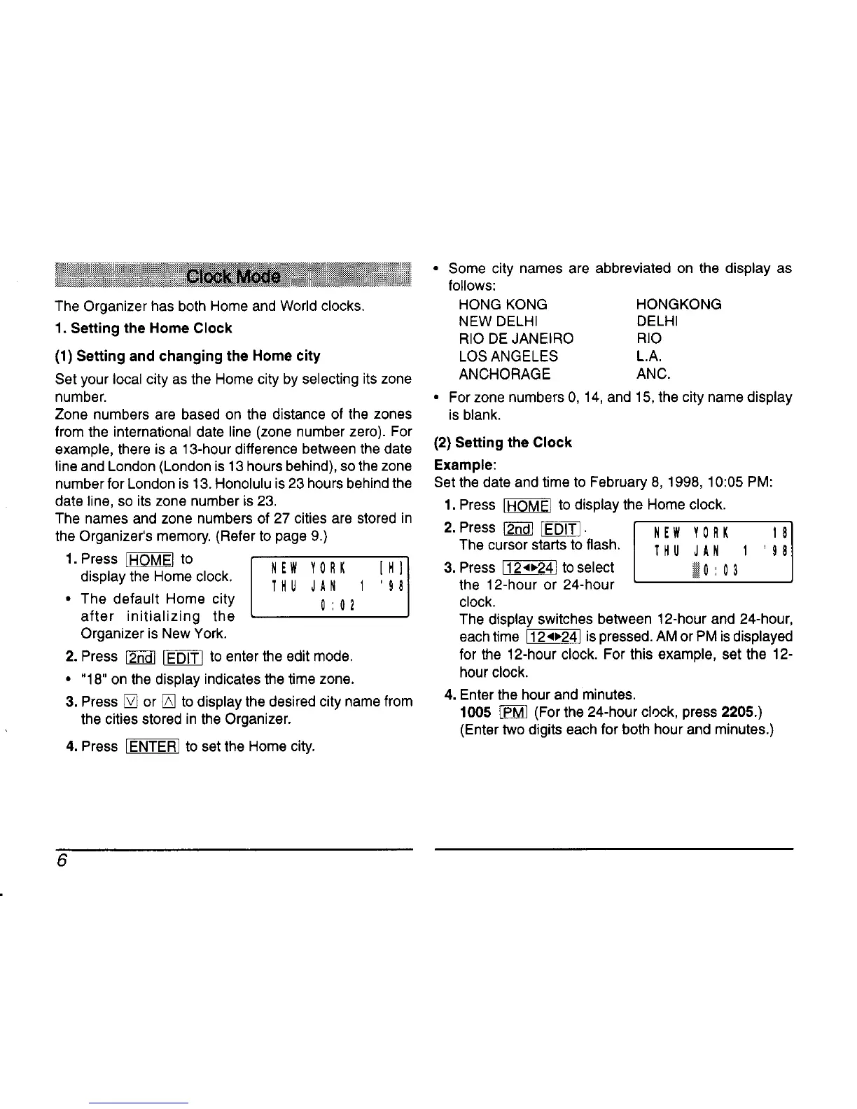 Sharp EL-6560 - Clock Mode; Setting the Home Clock; Setting the Clock; Setting and Changing the Home City