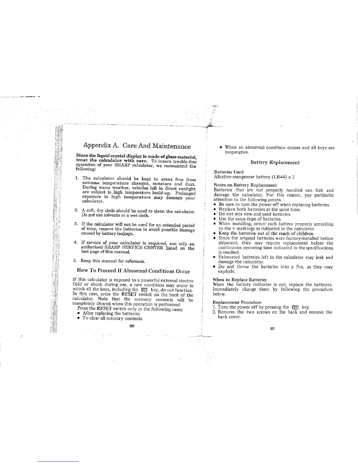 Sharp EL-733A - Care and Maintenance; How to Proceed if Abnormal Conditions Occur; Battery Replacement