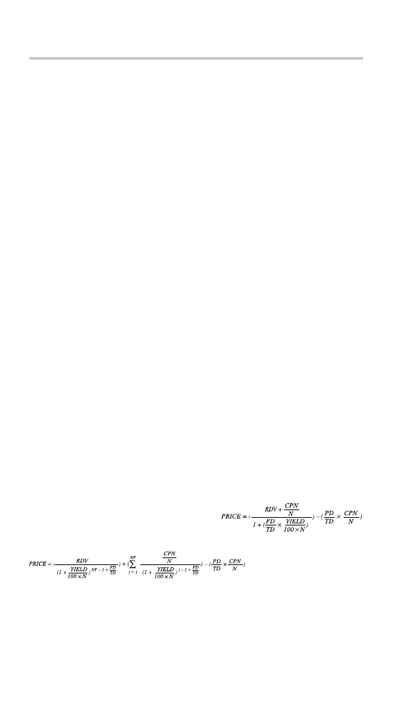 where CPN = COUPON(PMT), RDV = REDEMPT(FV), N = CPN/Y(N), YIELD = YIELD(I/Y),