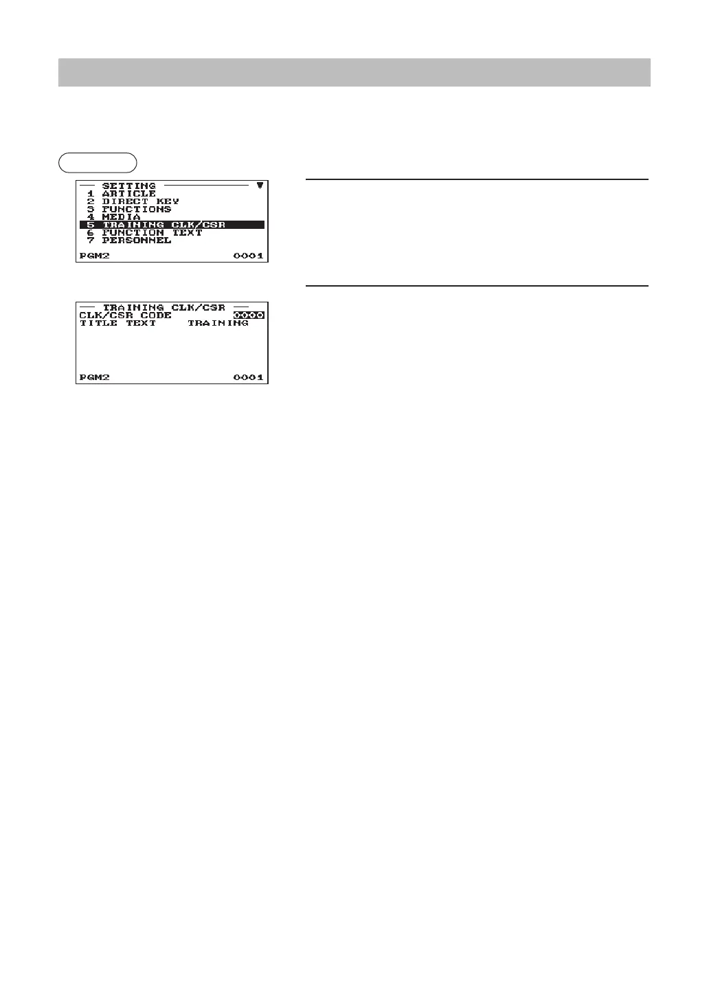 Select “TRAINING CLK/CSR” in the SETTING window. You can set the text for the training mode title and