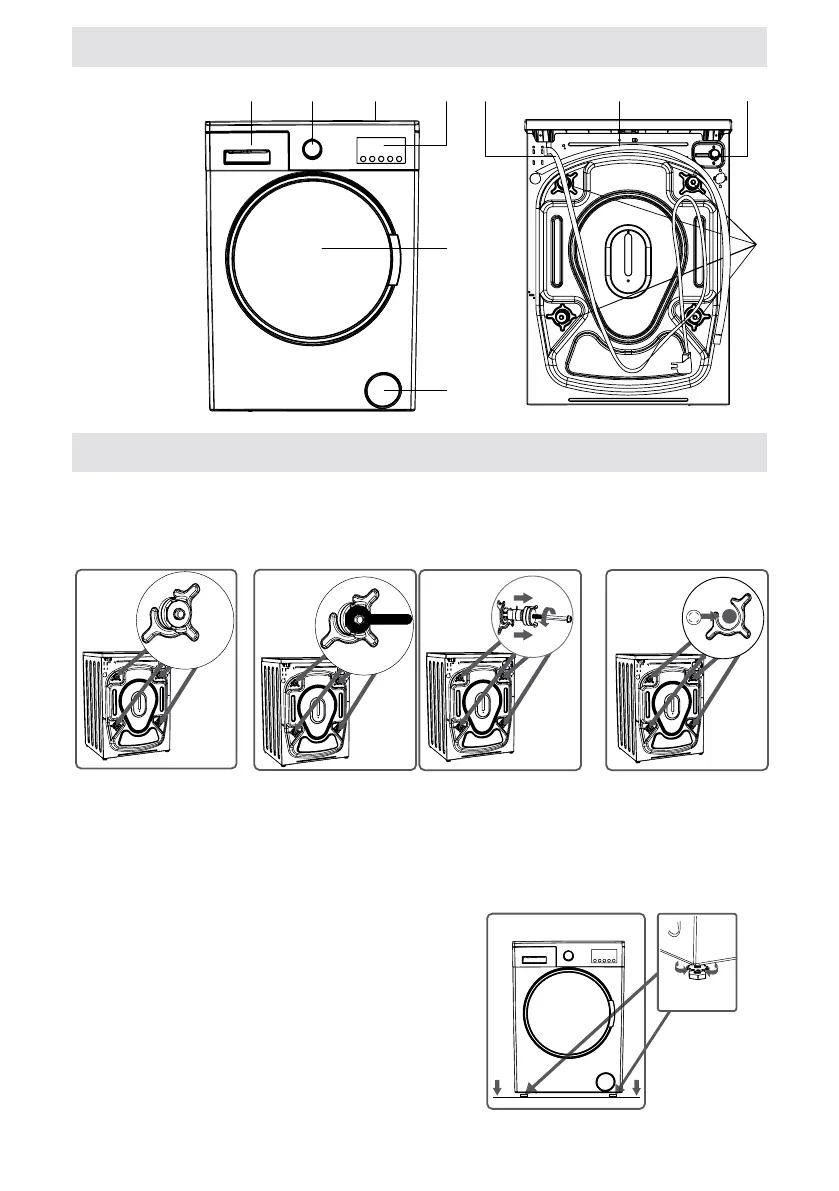 A készülék használata előtt távolítsa el a mosógép hátuljáróla szállításhoz használt 4 db rögzítő csavart és gumi