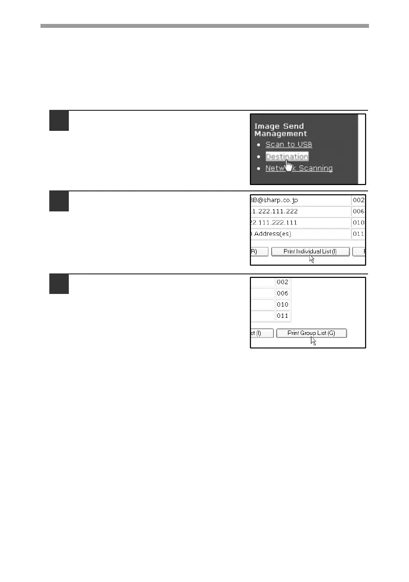 • Print individual list: Shows the information programmed in e-mail, FTP, desktop,