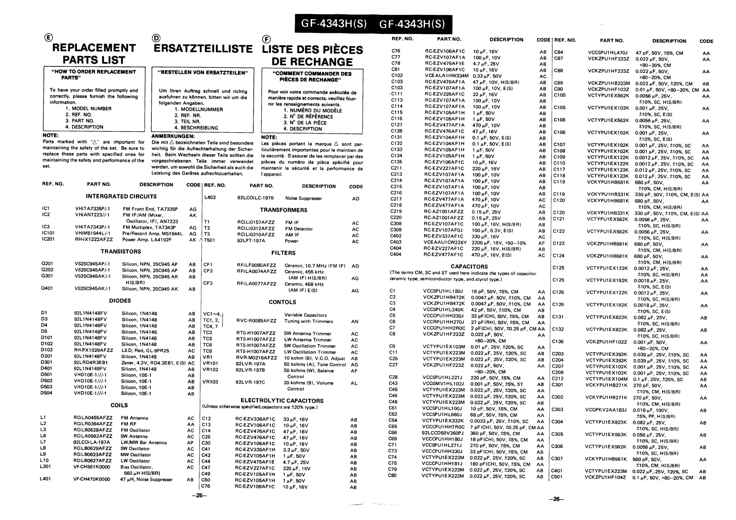 Sharp GF-4343H - Replacement Parts List; Liste des Pieces de Rechange