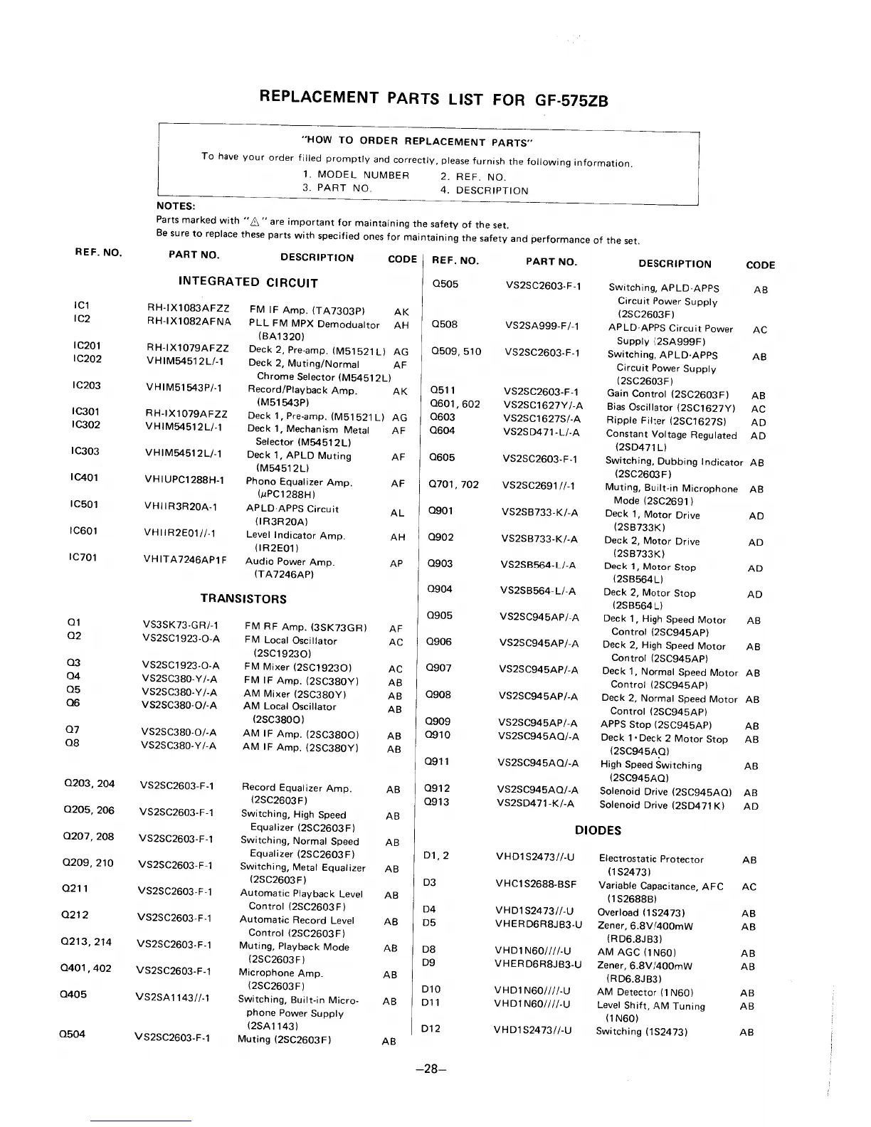 Sharp GF-575ZB - Replacement Parts List; Integrated Circuits and Transistors; Diodes and Other Components