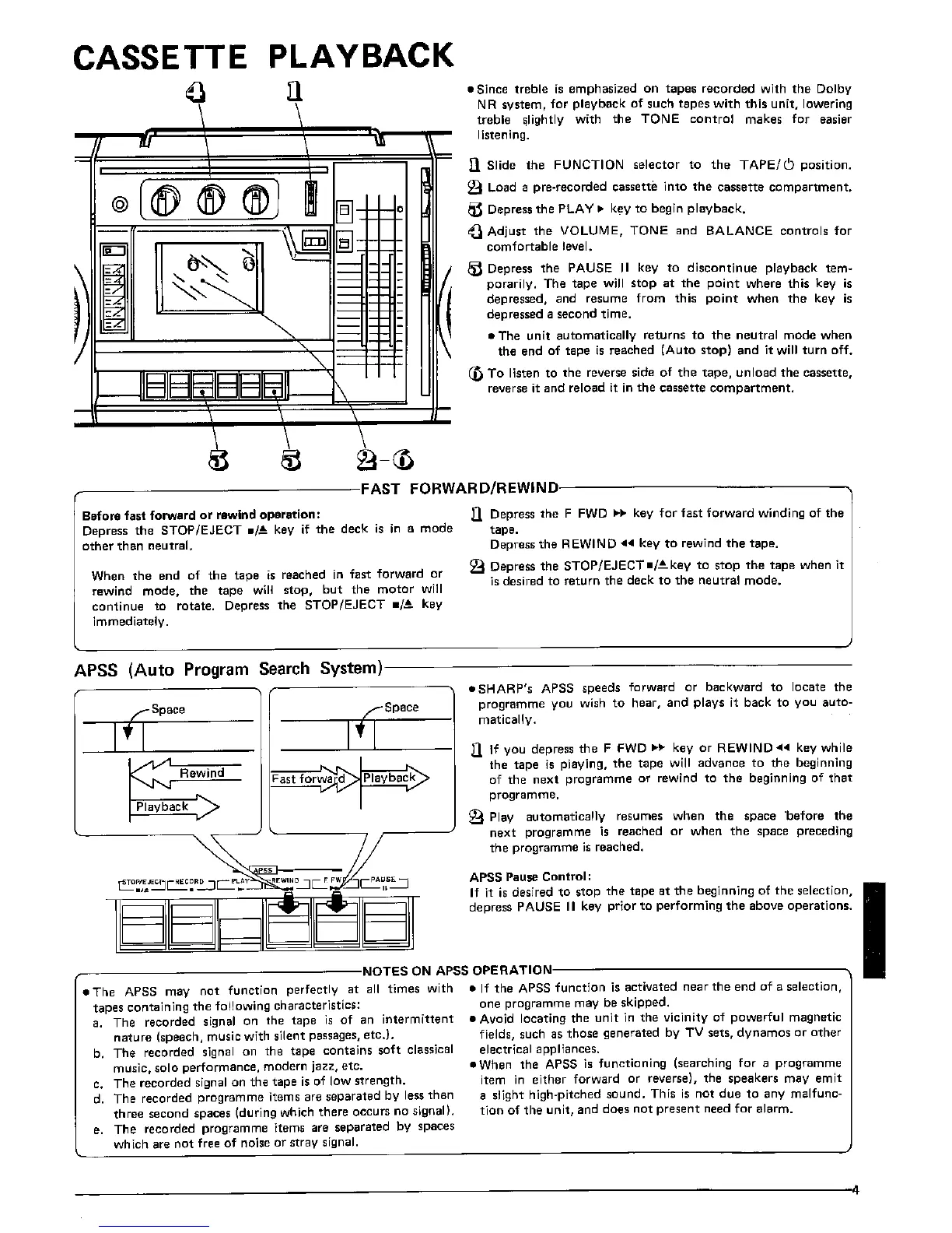 Sharp GF-7300H - Cassette Playback; Fast Forward;Rewind; Apss; Notes on APSS Operation