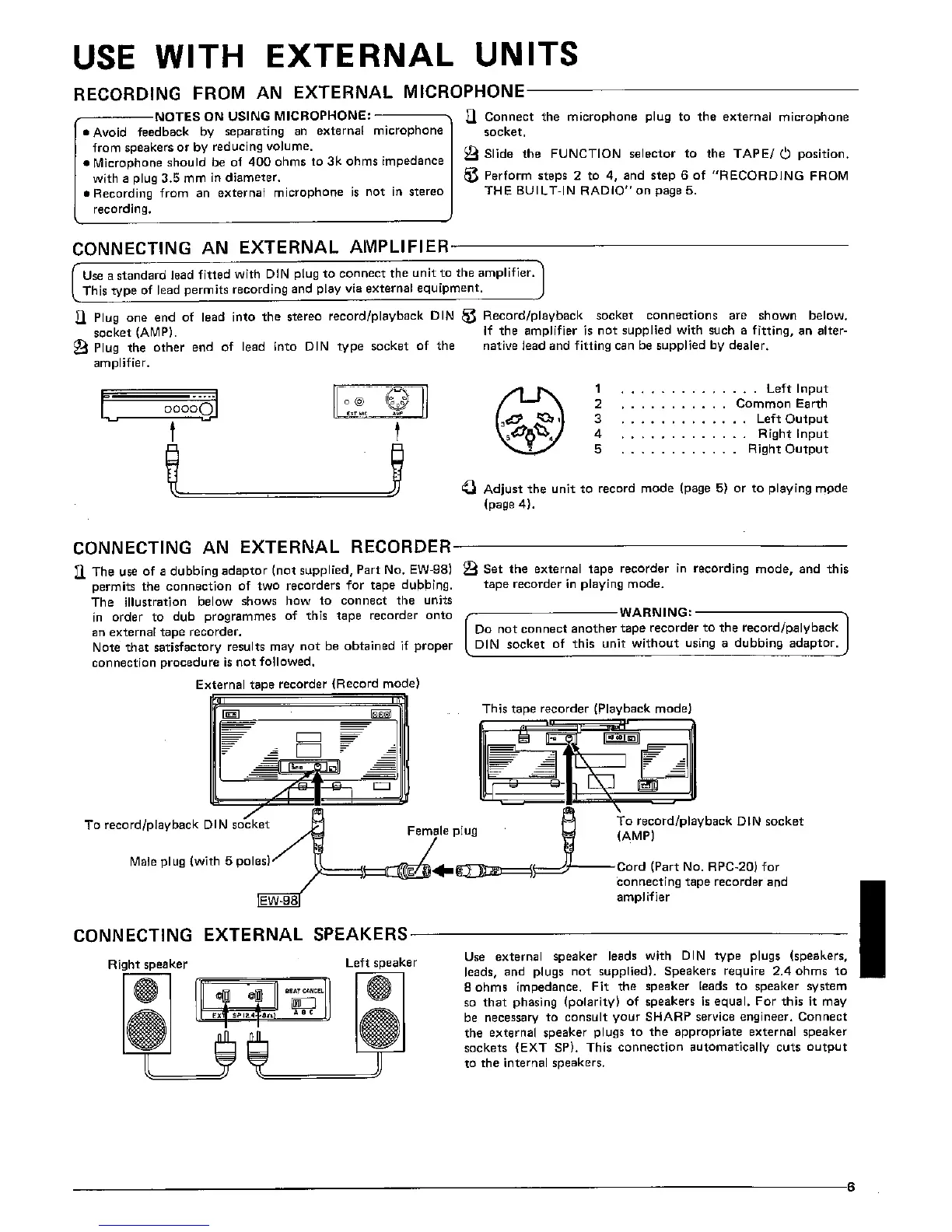 Sharp GF-7300H - Use with External Units; Recording from an External Microphone; Connecting an External Amplifier; Connecting an External Recorder