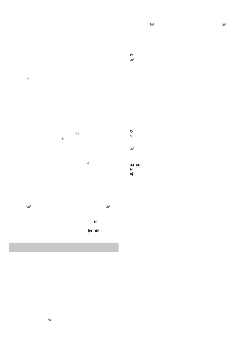 – Toista/keskeytä/jatka toistoa Bluetooth-/USB-tilassa.
