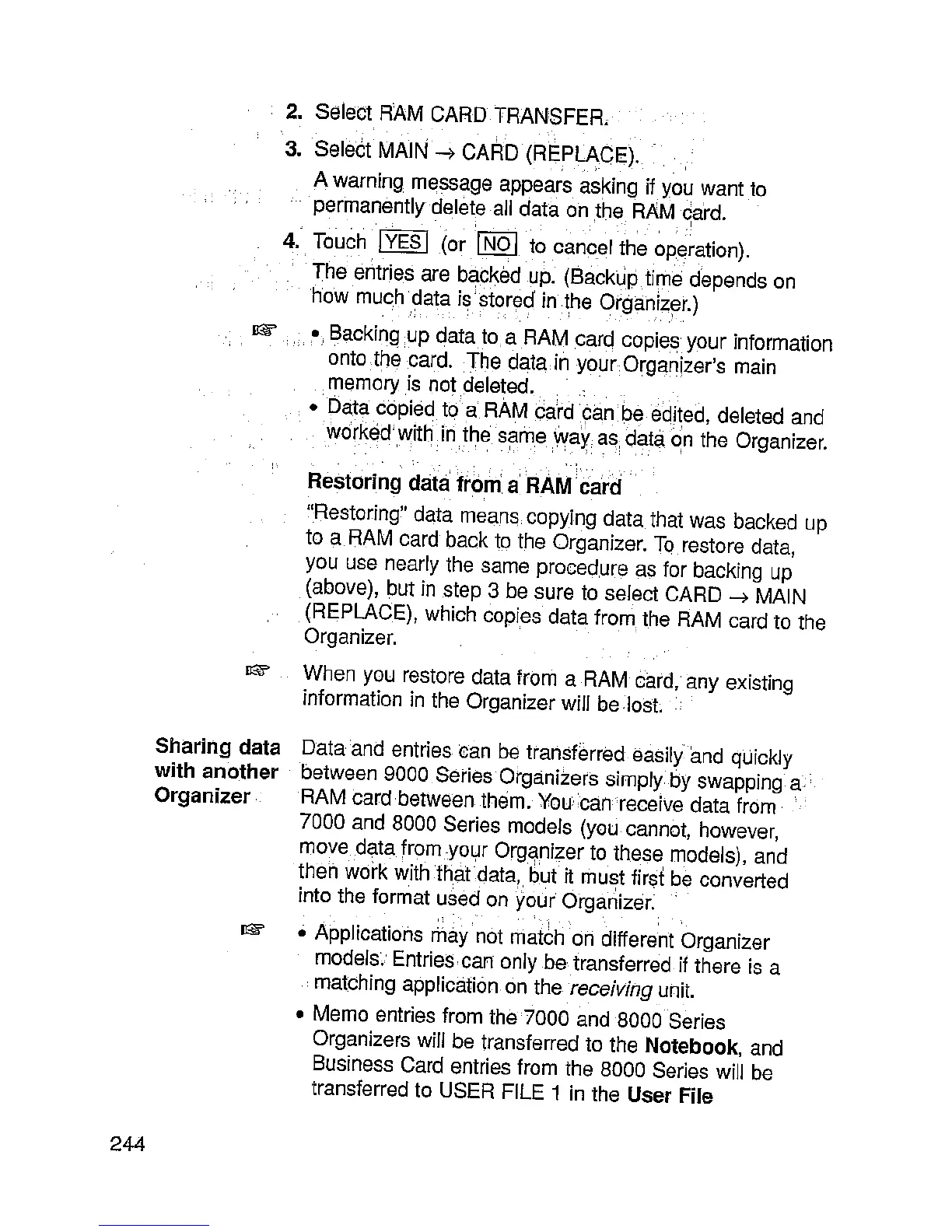 Sharp IQ-9000 - Sharing Data with Another Organizer; Restoring Data from a RAM Card