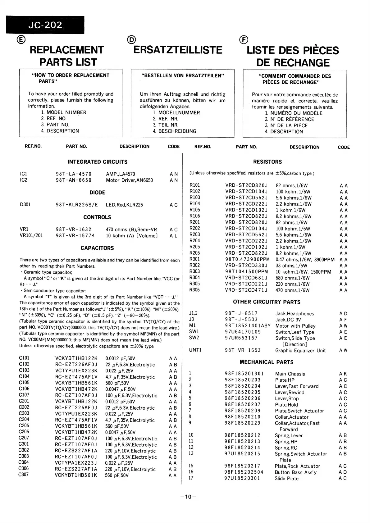 Sharp JC-202 - Replacement Parts List; Liste des Pieces de Rechange