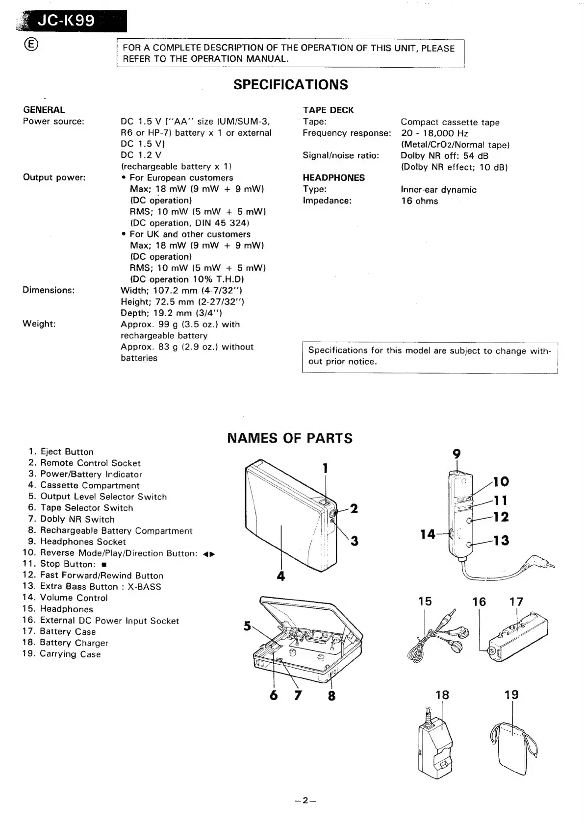 Sharp JC-K99 - Specifications; Names of Parts