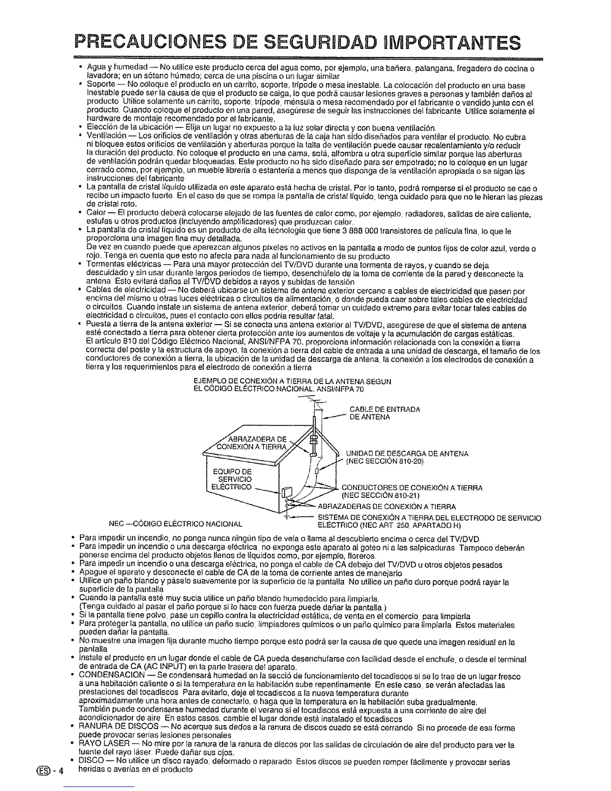 • Puesta a tierra de la antena exterior -- Si se conecta una antena exterior e_TViDVD, asegClrese de qua el sistema de antena