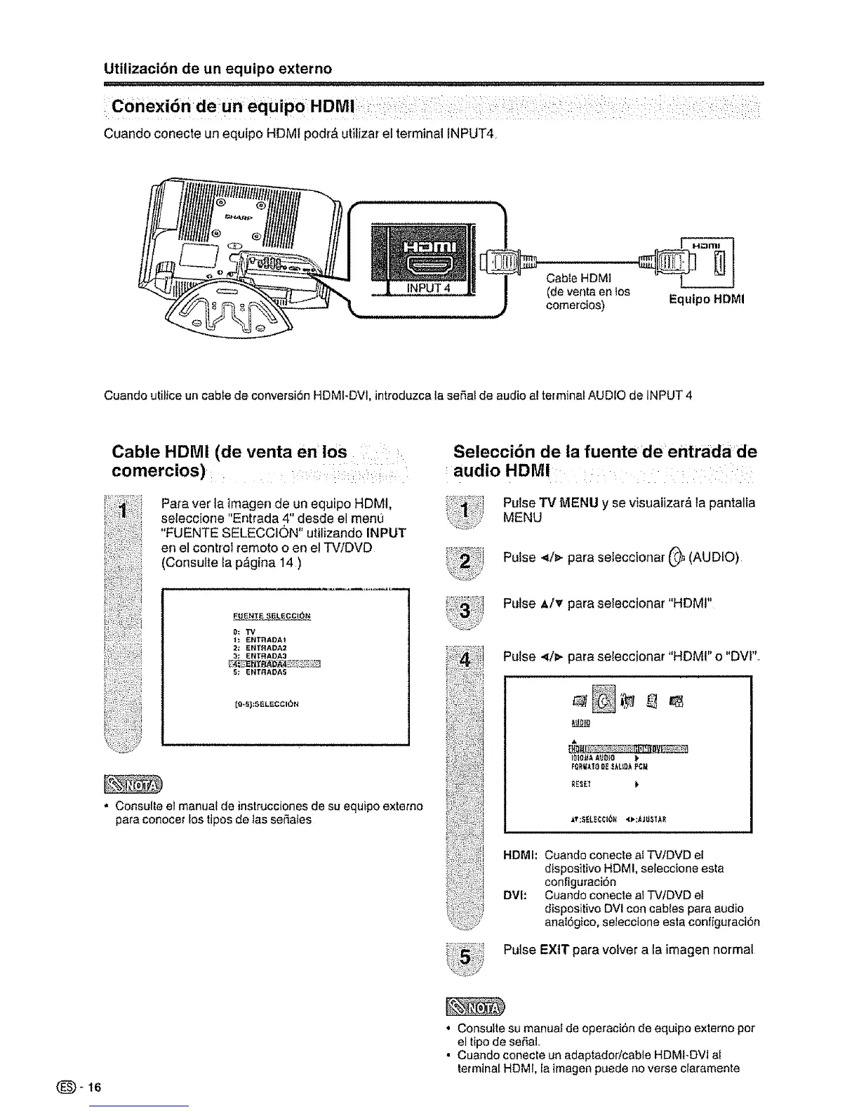 Cuando utilice un cable de conversi6n HDMbDVI, introduzca la seSal de audio a! terminal AUDIO de INPUT 4