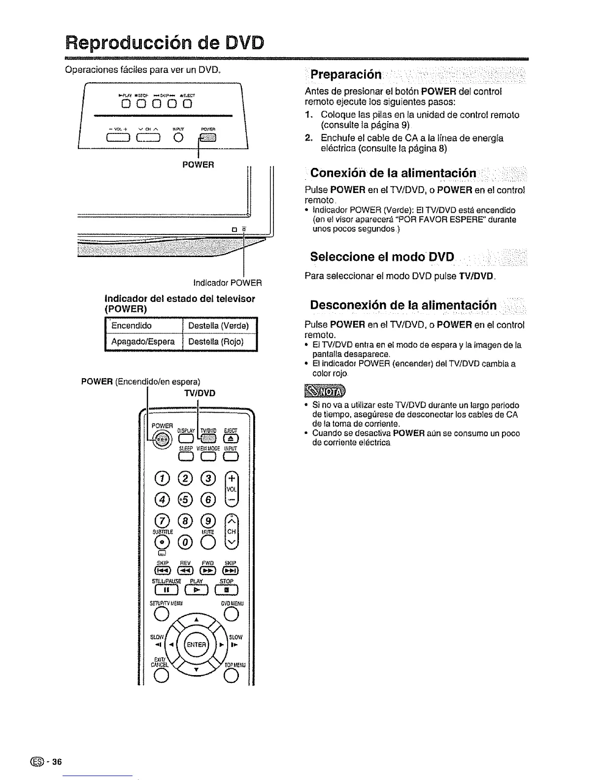 • lndicador POWER (Verde): El TV/DVD est_ encendfdo