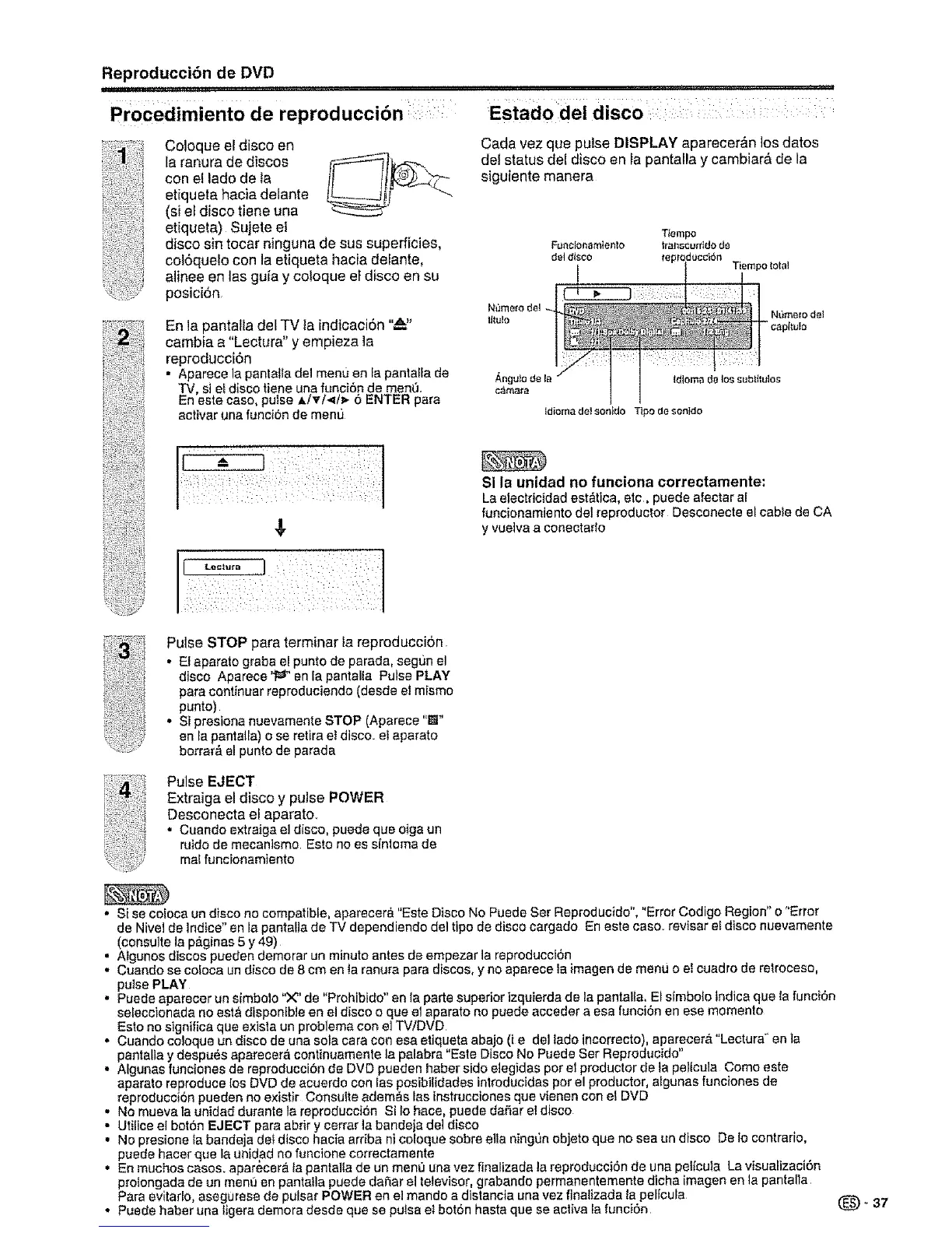 • Si se coloca un disco no compatible, aparecer& "Este Disco No Puede Set Reproduc}do", "Error Codigo Region" o "Error