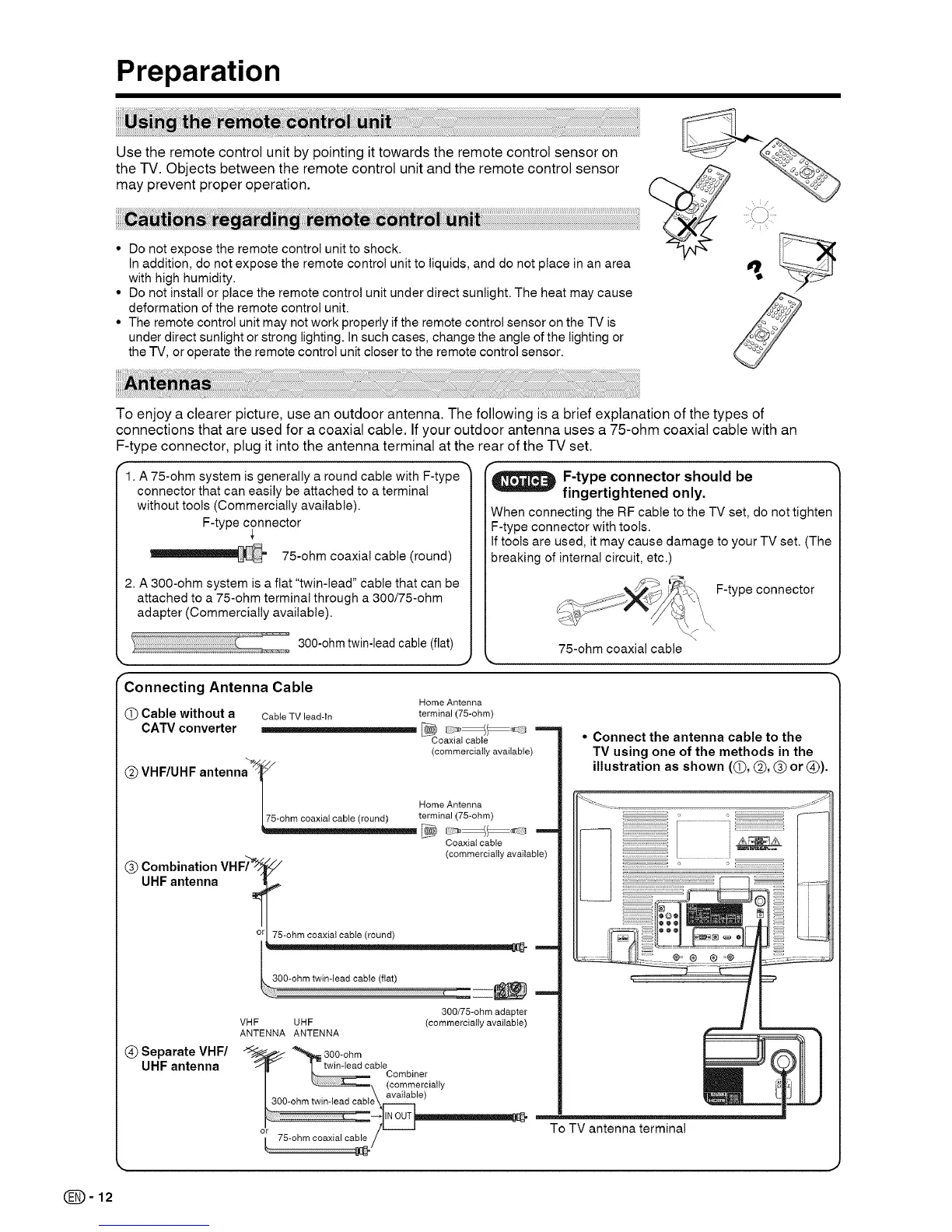 F-type connector, plug it into the antenna terminal at the rear of the TV set.