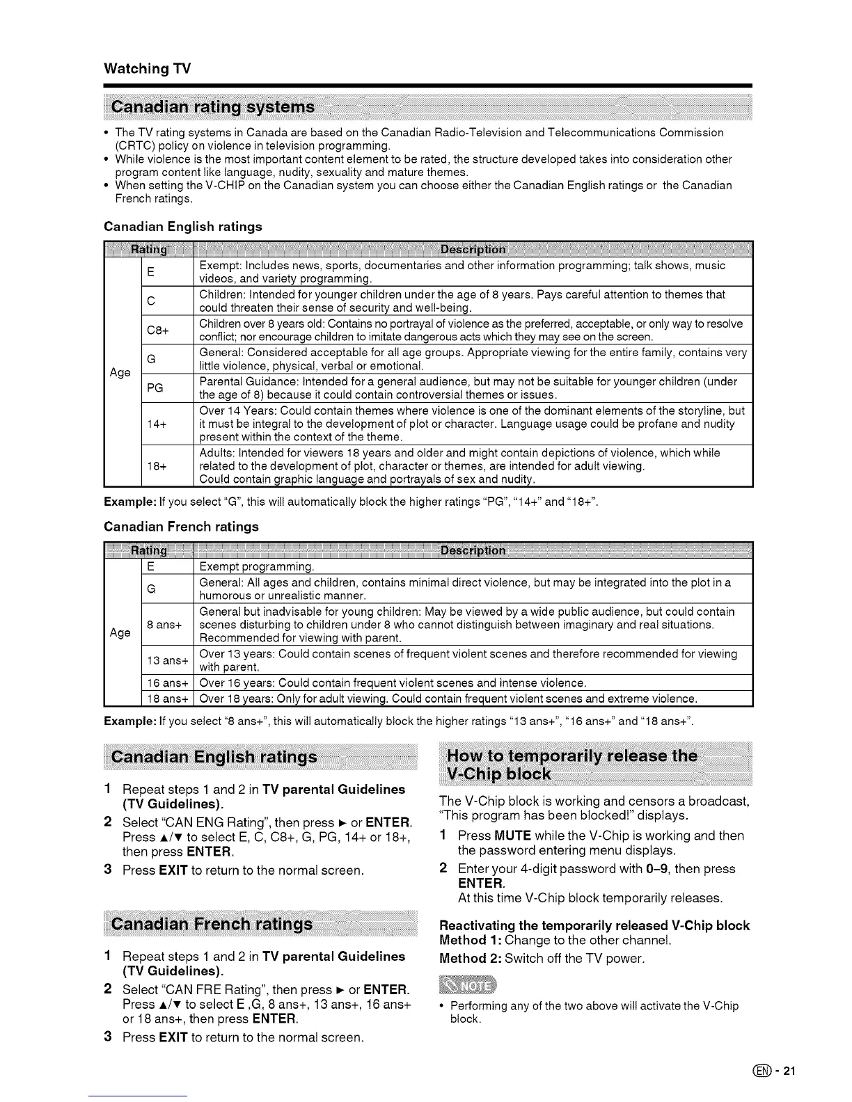 • When setting the V-CHIP on the Canadian system you can choose either the Canadian English ratings or the Canadian