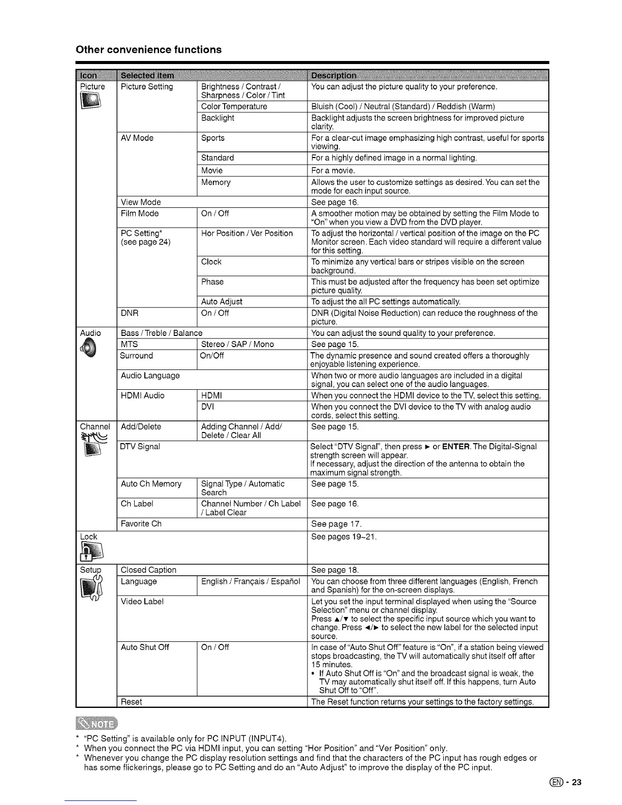* "PC Setting" is available only for PC INPUT (INPUT4).