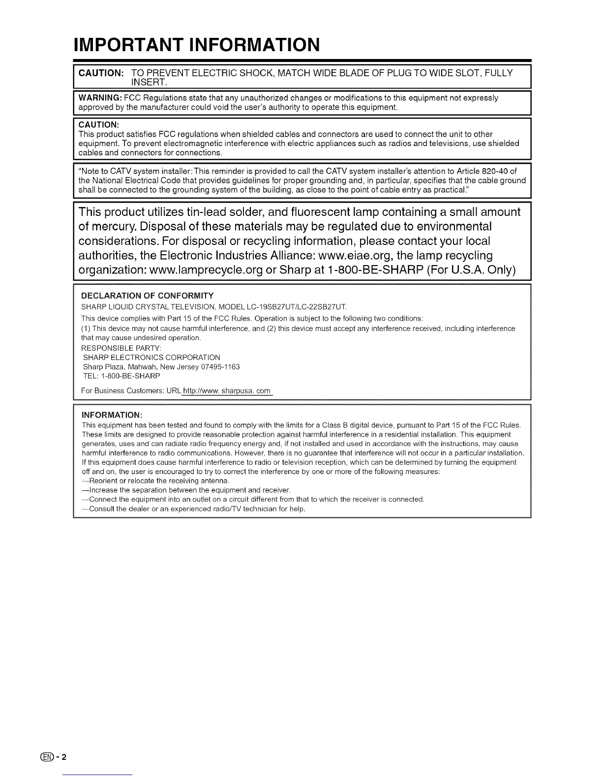 SHARP LIQUID CRYSTAL TELEVISION, MODEL LC-19SB27UT/LC-22SB27UT.